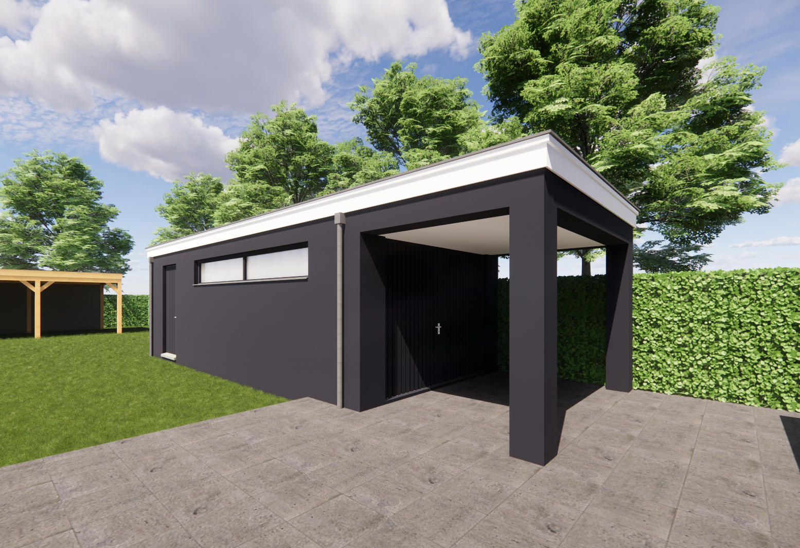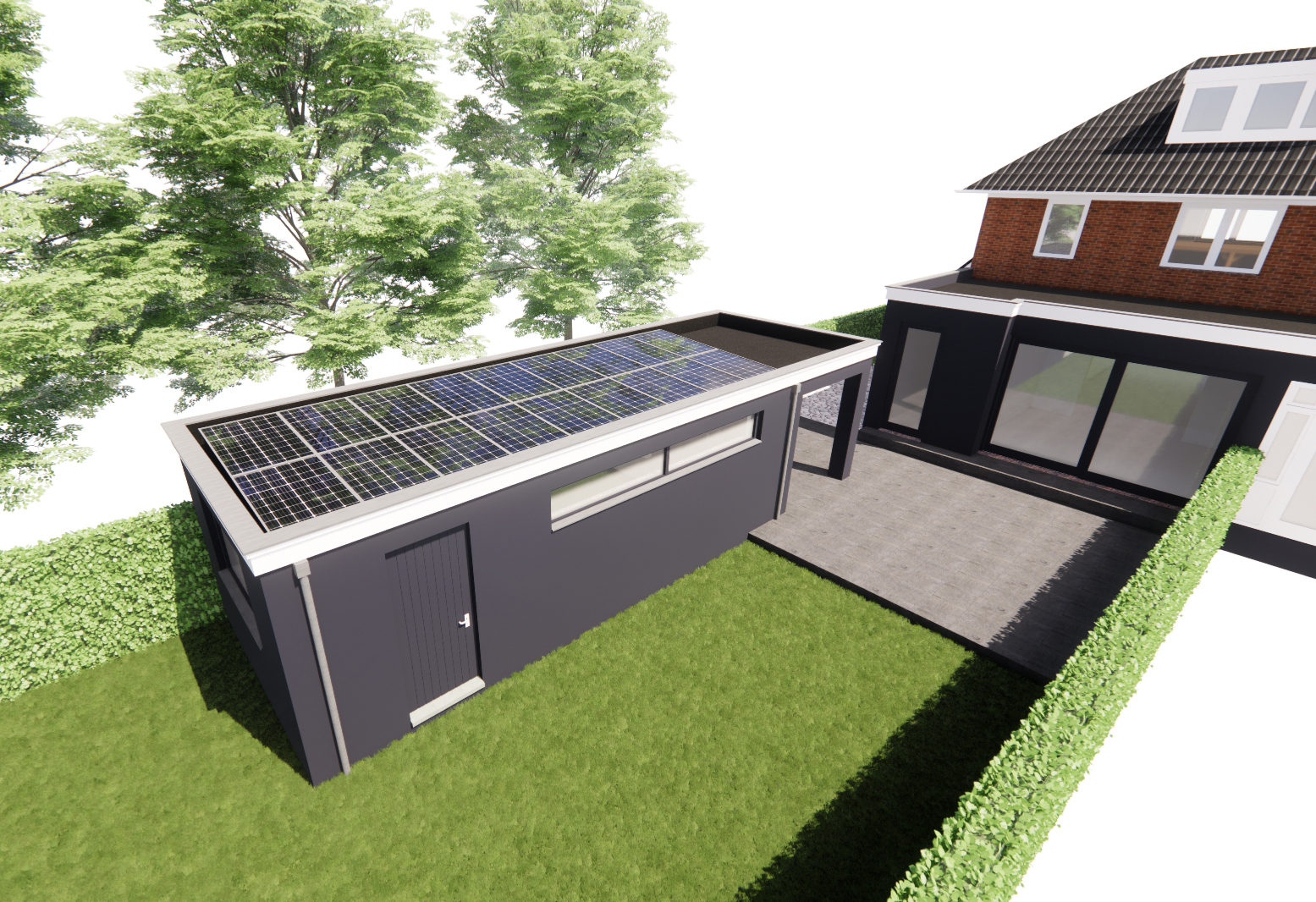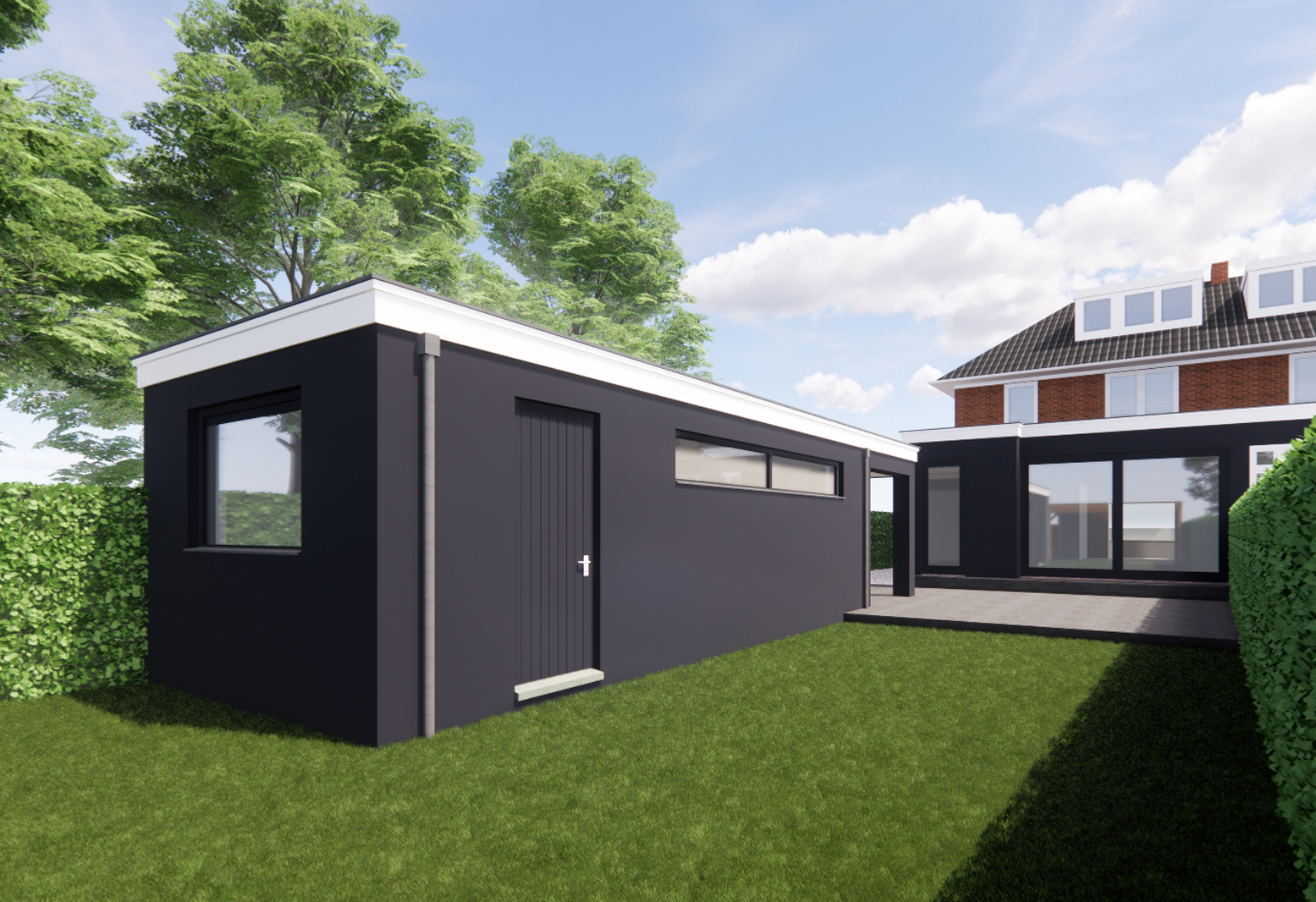 We hebben ervoor gekozen de berging te laten aansluiten bij de bestaande uitbouw. De donker gestucte buitenkant en witte daklijn vormen een duidelijk afleesbare eigen sfeer, waardoor er een mooi contrast ontstaat tussen de nieuwe toevoegingen en de bestaande woning.