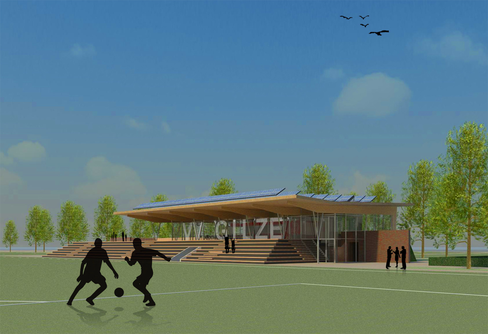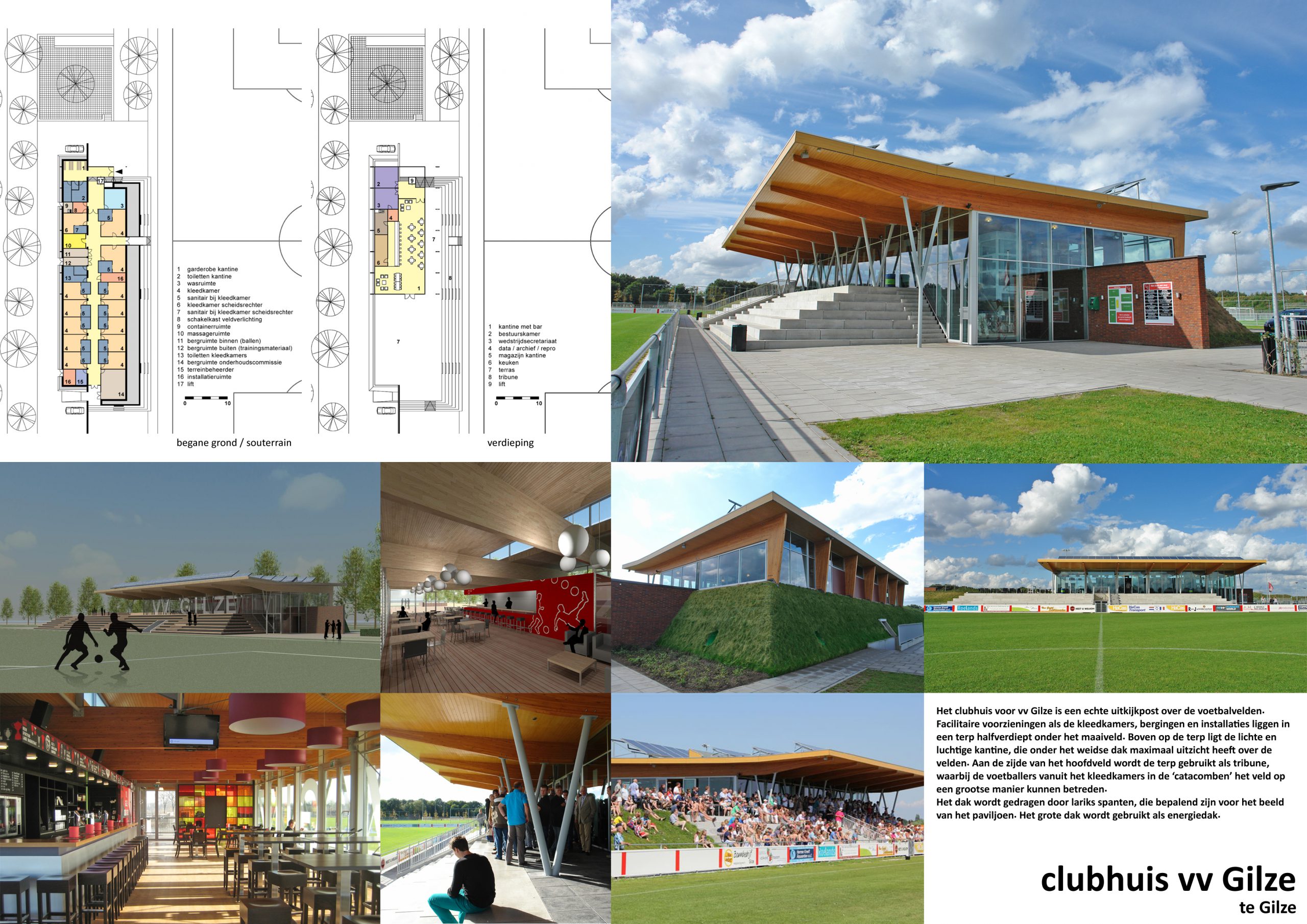 Het clubhuis voor vv Gilze is een echte uitkijkpost over de voetbalvelden. Facilitaire voorzieningen als de kleedkamers, bergingen en installaties liggen in een terp halfverdiept onder het maaiveld.