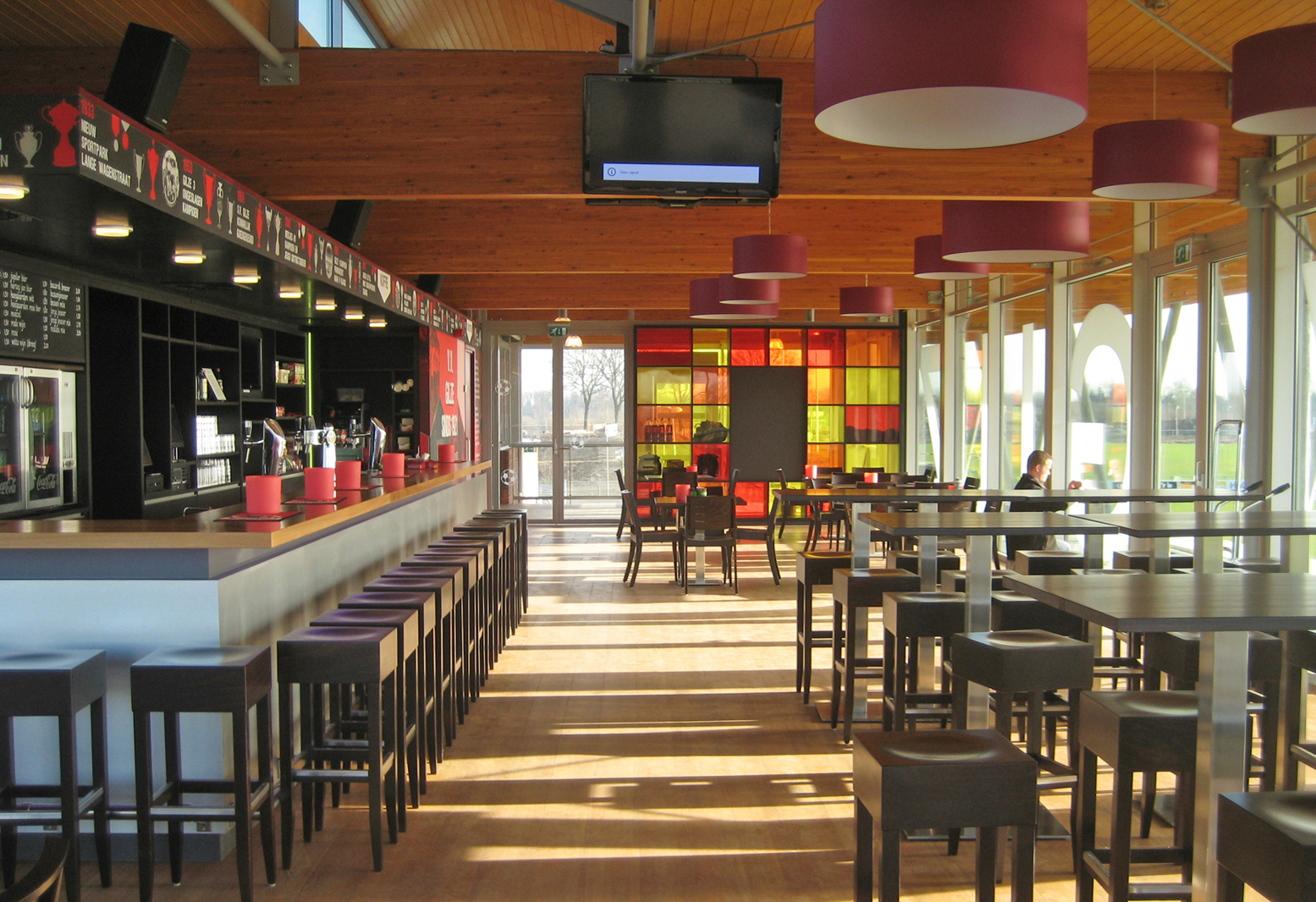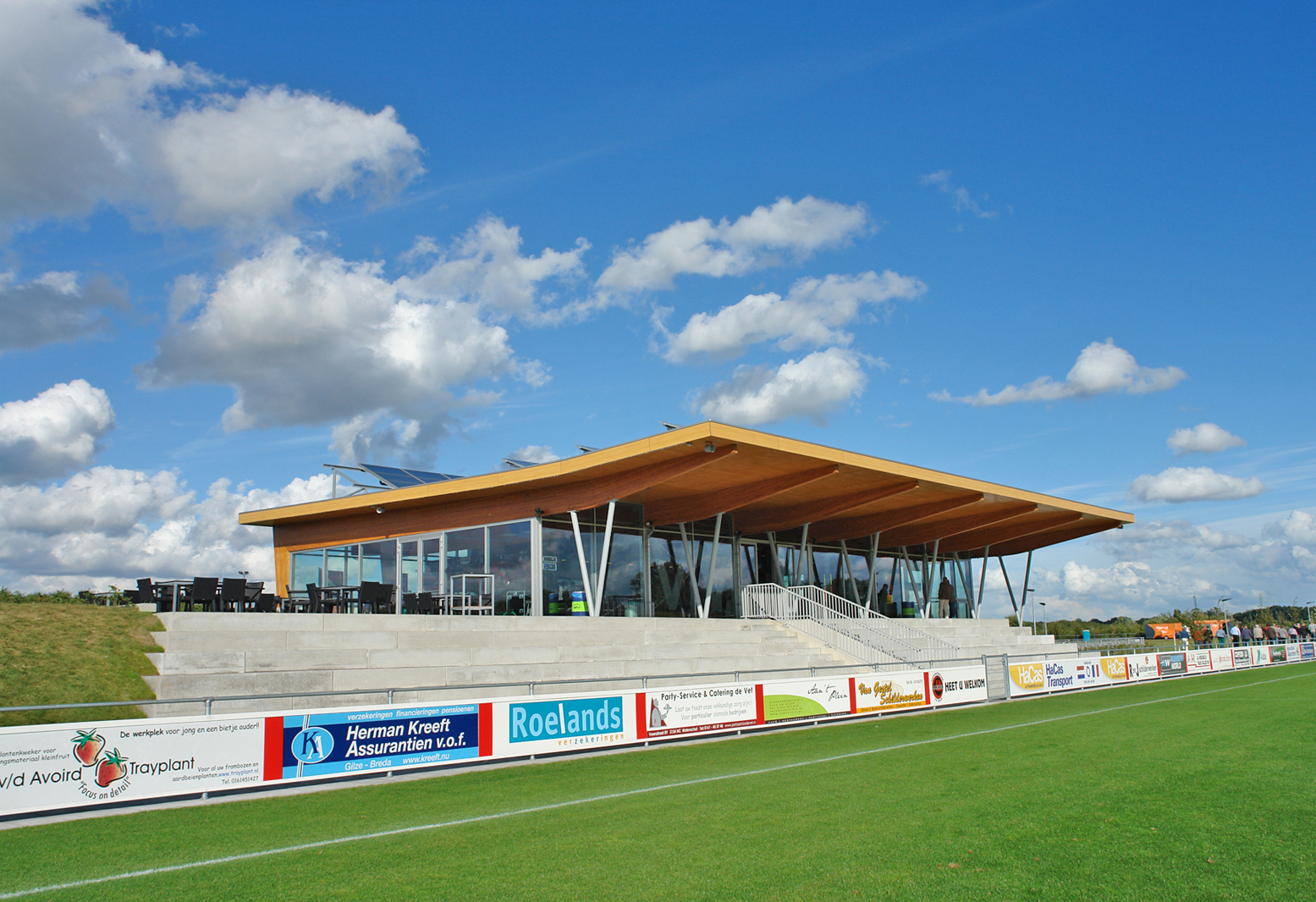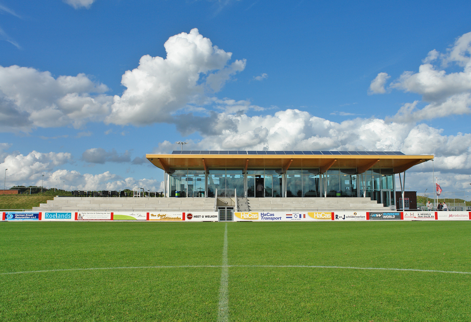 Boven op de terp ligt de lichte en luchtige kantine, die onder het weidse dak maximaal uitzicht heeft over de velden. Aan de zijde van het hoofdveld wordt de terp gebruikt als tribune, waarbij de voetballers vanuit het kleedkamers in de ‘catacomben’ het veld op een grootse manier kunnen betreden.
