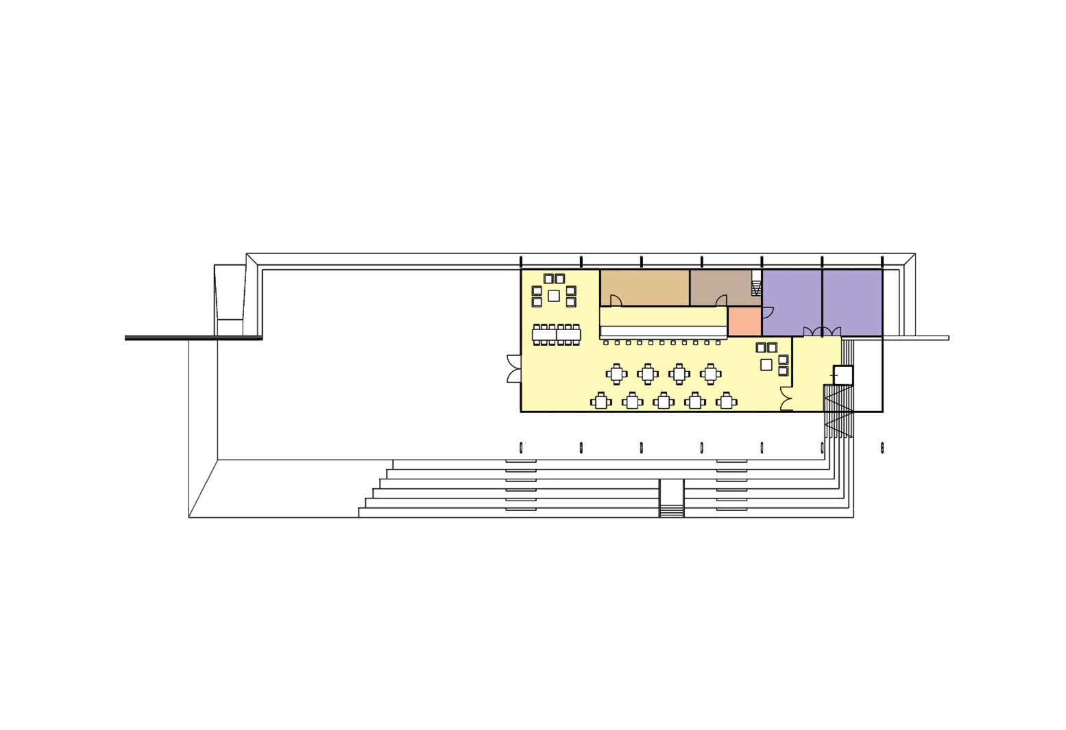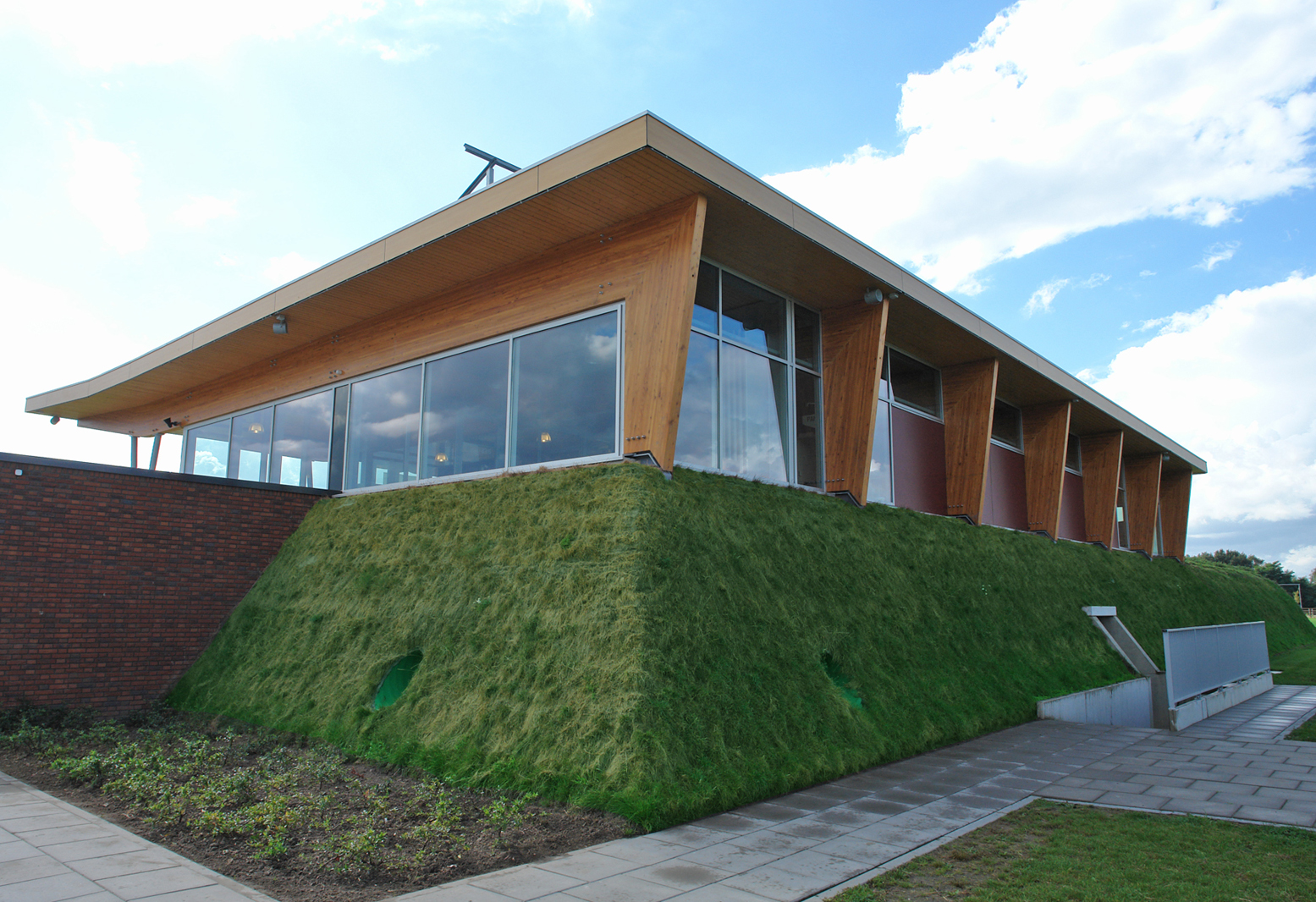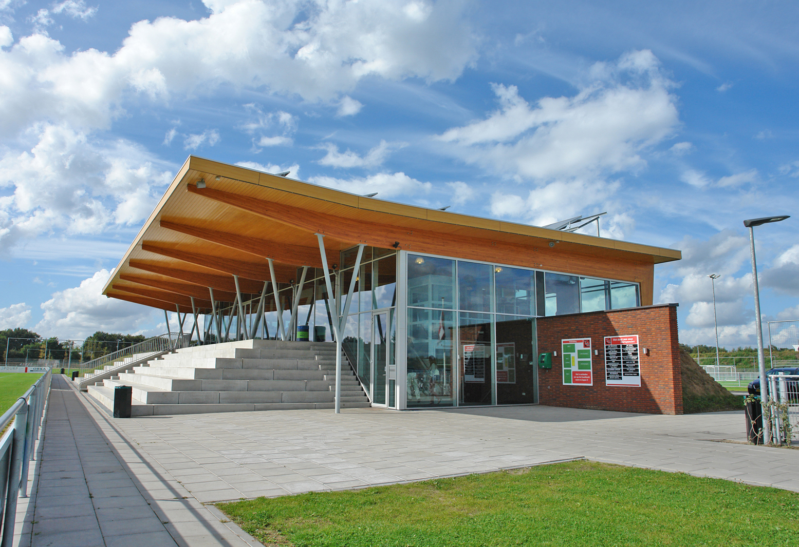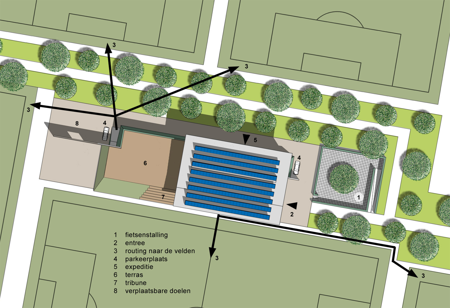 Boven op de terp ligt de lichte en luchtige kantine, die onder het weidse dak maximaal uitzicht heeft over de velden. Aan de zijde van het hoofdveld wordt de terp gebruikt als tribune, waarbij de voetballers vanuit het kleedkamers in de ‘catacomben’ het veld op een grootse manier kunnen betreden.