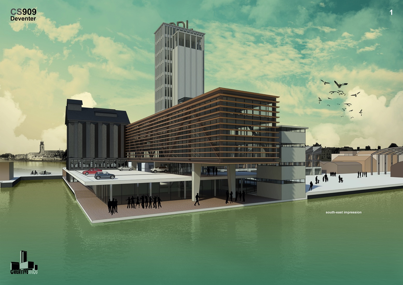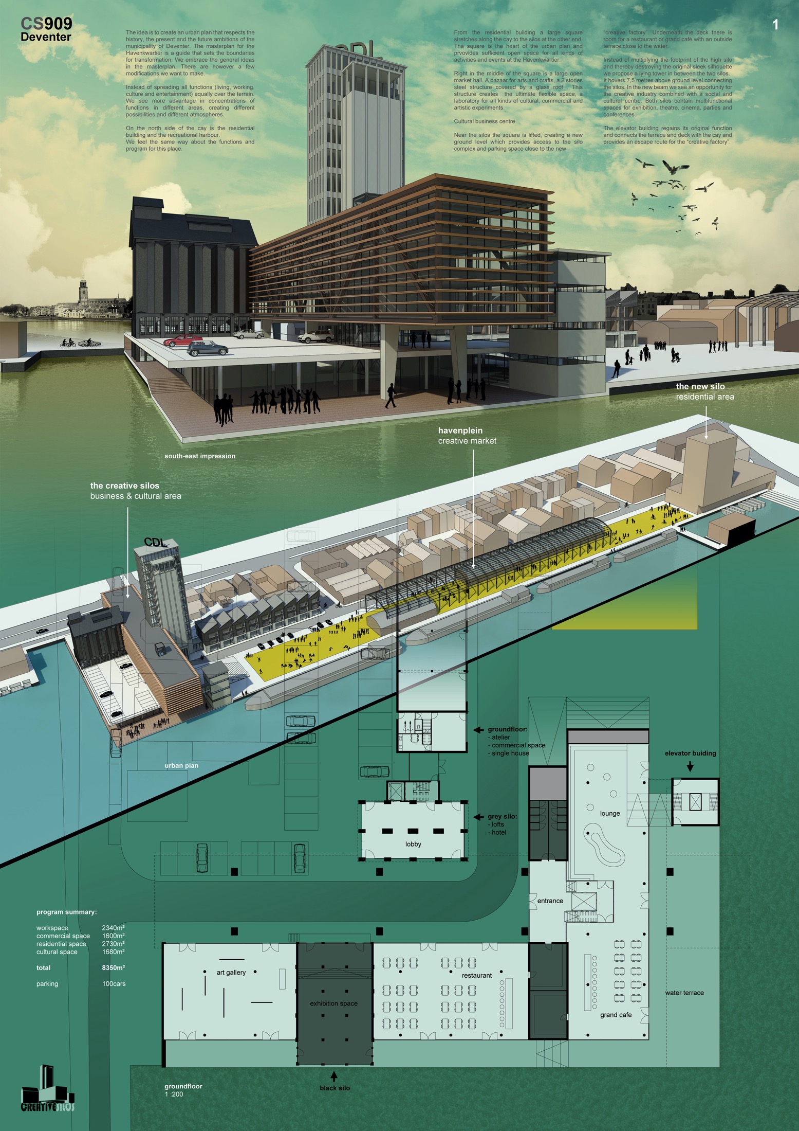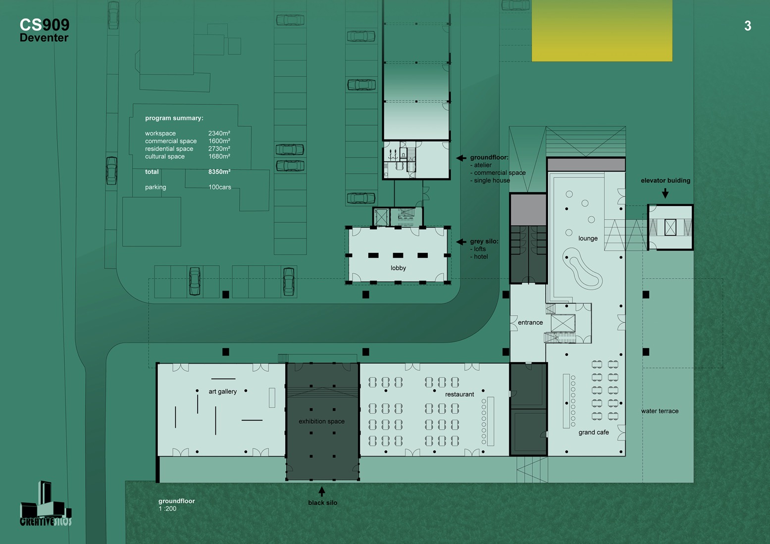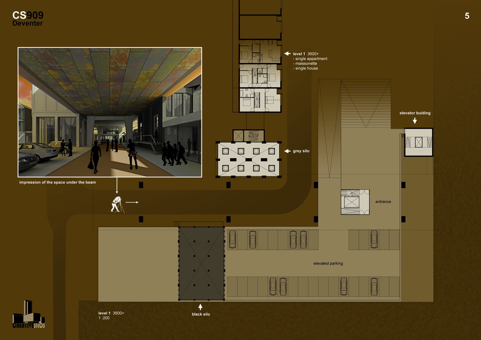 Nabij de silo’s wordt het plein opgetild, waarmee een nieuw maaiveld wordt gecreëerd, dat toegang geeft tot het silocomplex. Het biedt ook ruimte voor parkeren bij deze nieuwe “creatieve fabriek”. Onder dit dek bevindt zich een restaurant of grand café met terras aan het water.