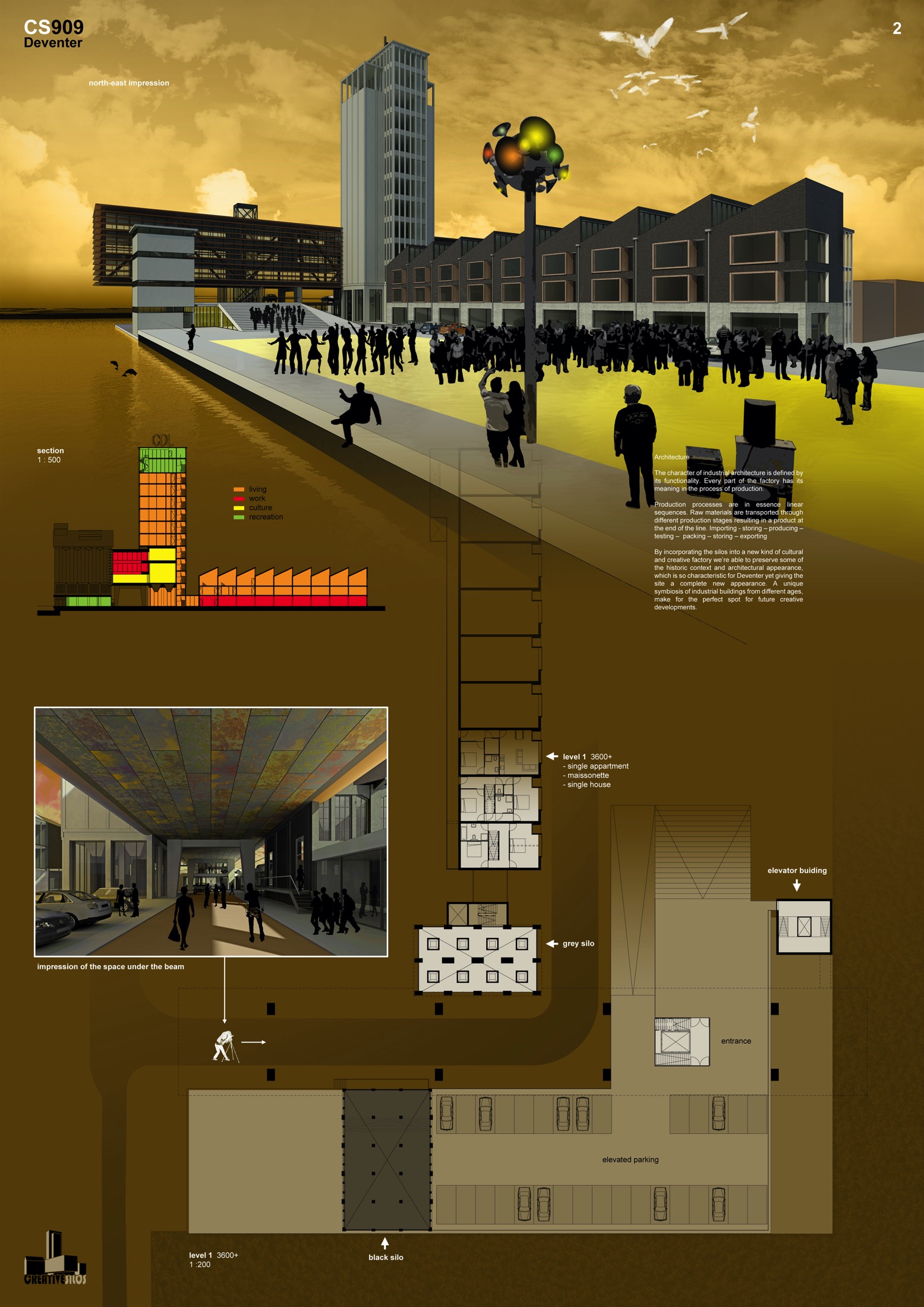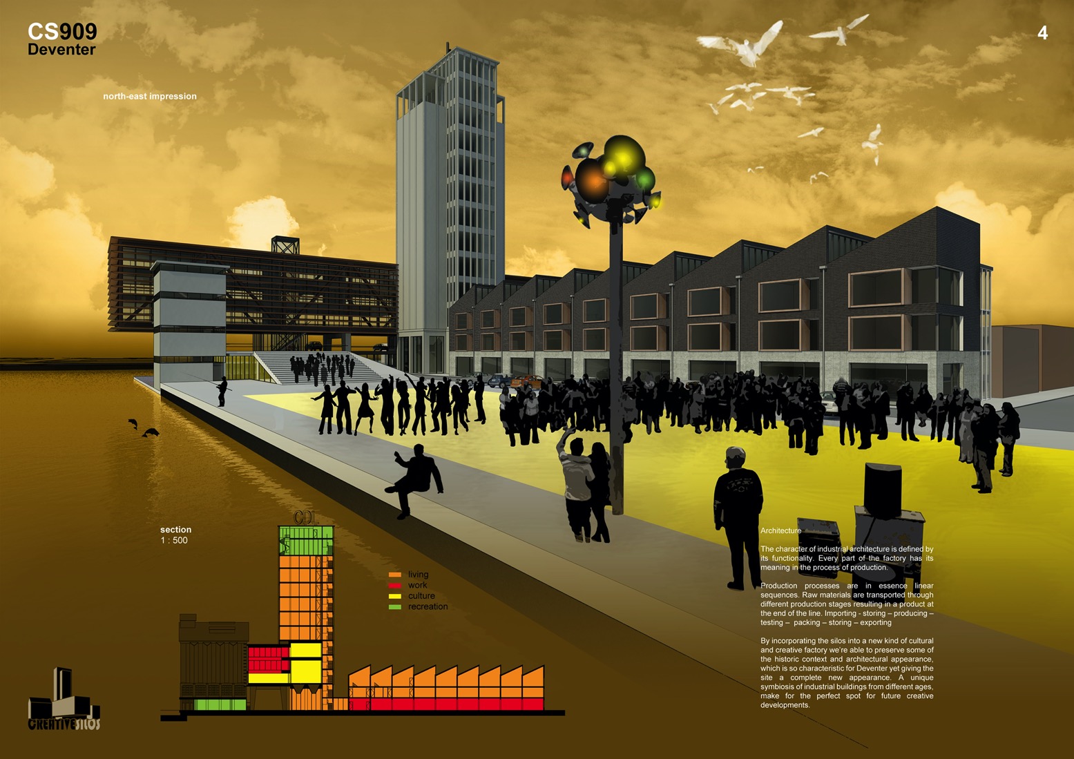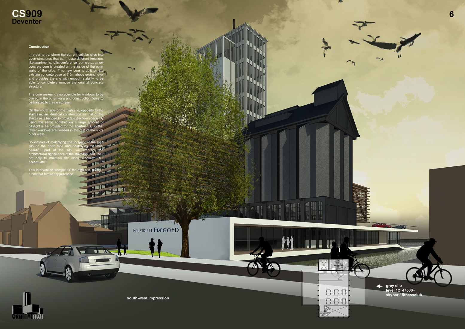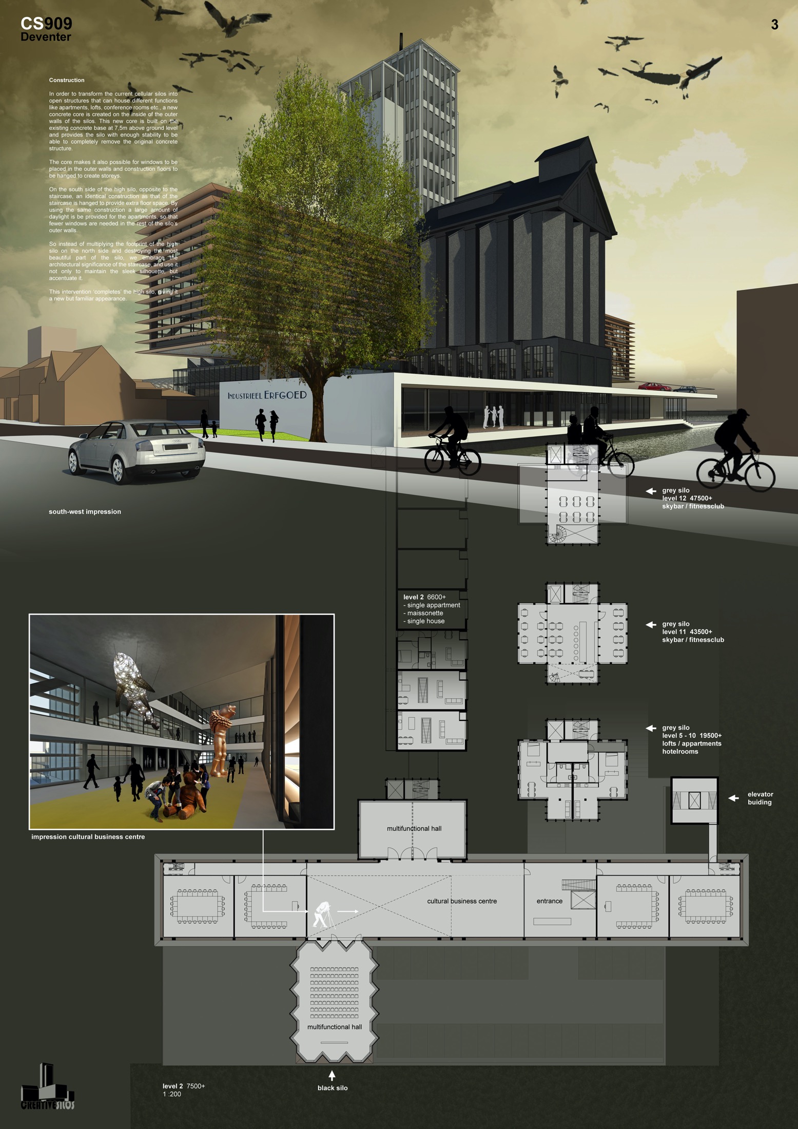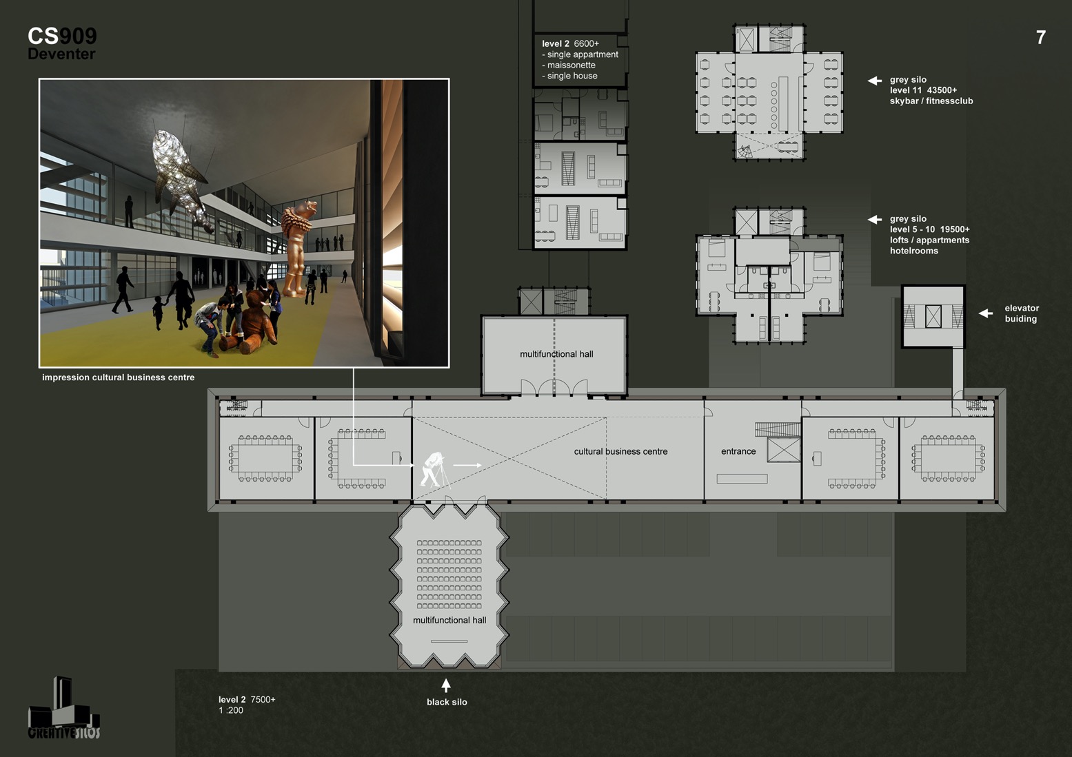 In plaats van het vergroten van de footprint van de hoge silo, waarmee het originele ranke silhouet ervan verloren zou gaan, stellen wij een “liggende” toren voor tussen de silo’s. Het zweeft 7,5 m boven het maaiveld en verbindt beide silo’s. In deze nieuwe “balk” zien wij mogelijkheden voor de creatieve sector gecombineerd met een sociaal en cultureel centrum. Beide silo’s bevatten multifunctionele ruimtes voor tentoonstellingen, theater, film, feesten en conferenties.