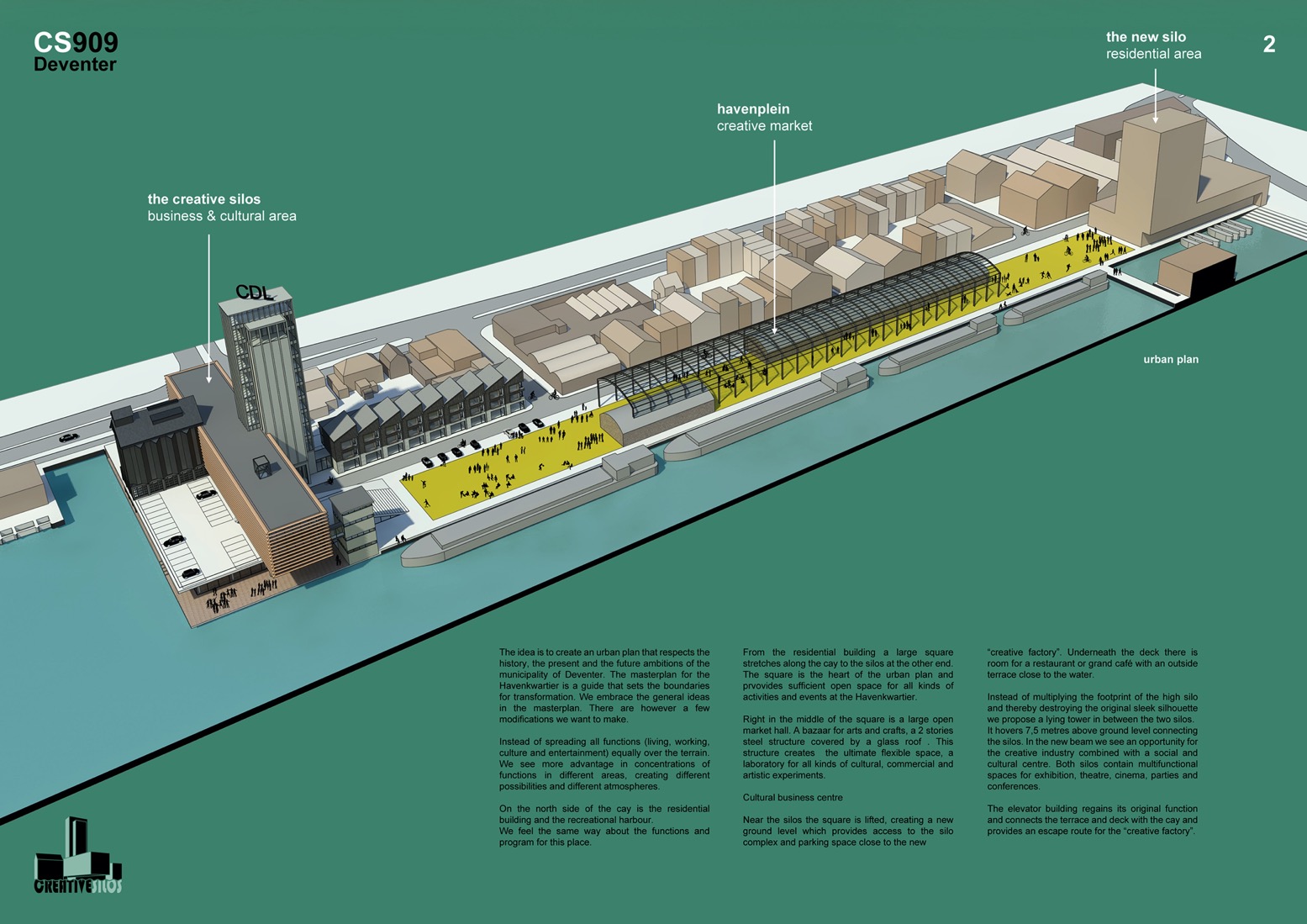 In plaats van een evenredig verdeling van functies (wonen, werken, cultuur en entertainment) over het gebied, zien wij meer voordelen in het concentreren van functies in verschillende gebieden. Daarmee creëer je verschillende sferen en kansen. Aan de noordzijde van de kade komt het woonblok met een haven voor recreatieve doeleinden. Vanaf het woonblok strekt zich een groot plein uit over de kade tot aan de silo’s aan het andere eind. Dit plein vormt het hart van het stedenbouwkundige plan en voorziet in voldoende open ruimte voor allerlei activiteiten in het Havenkwartier.