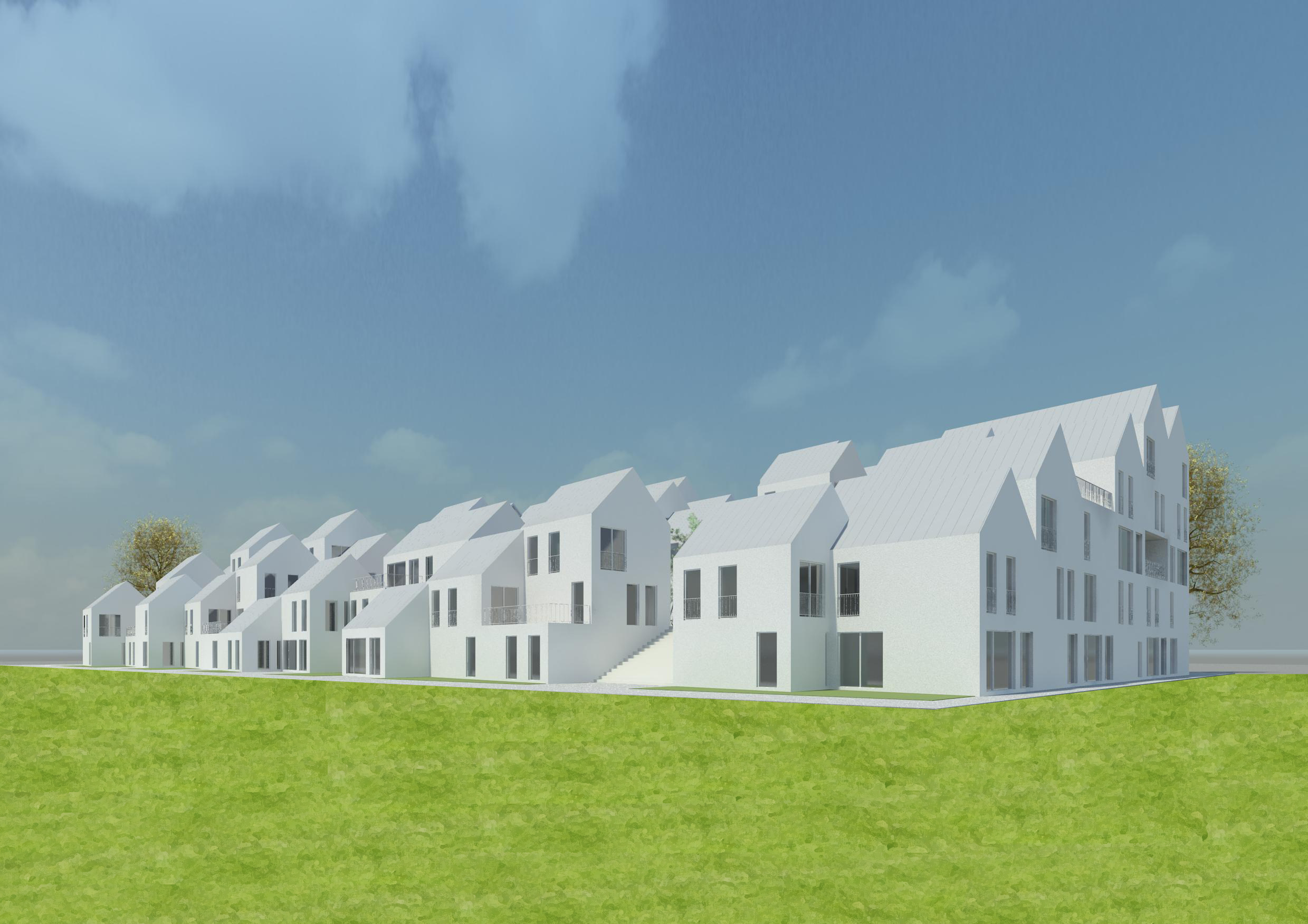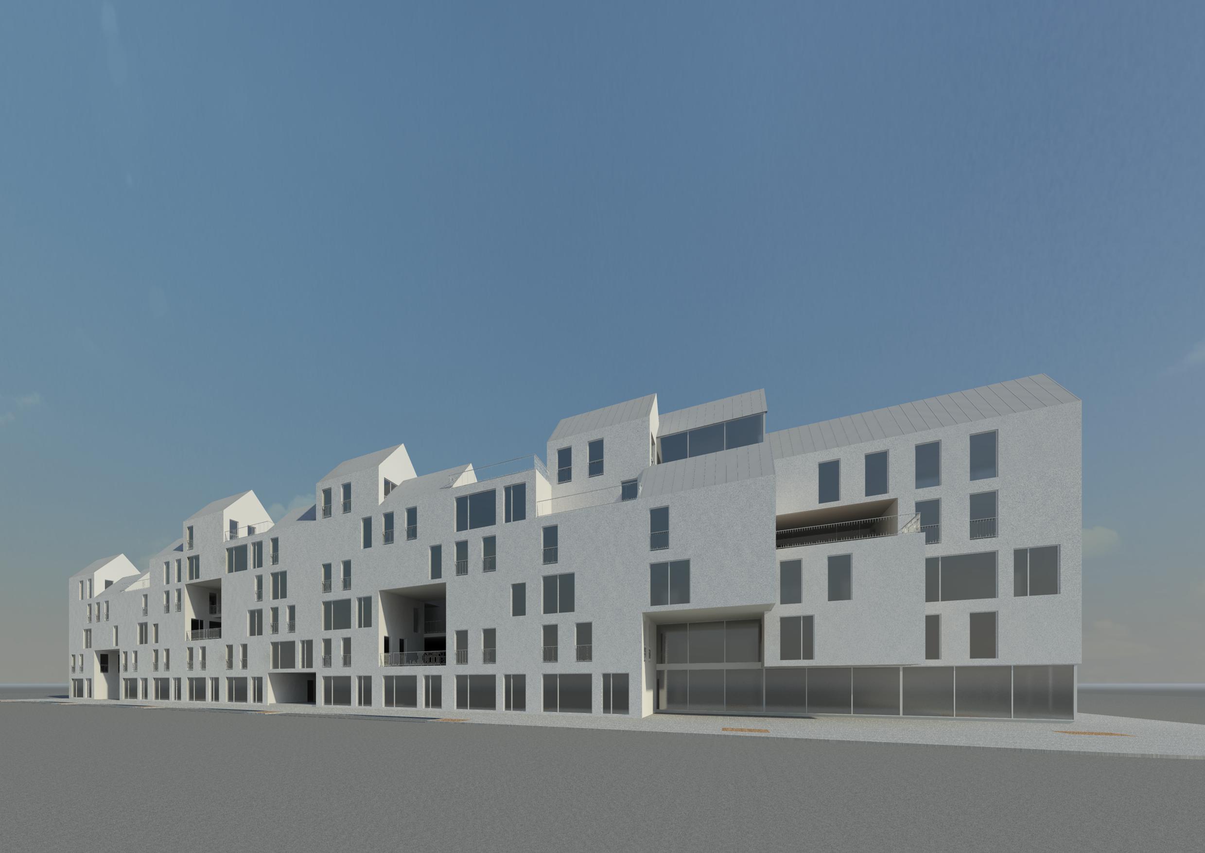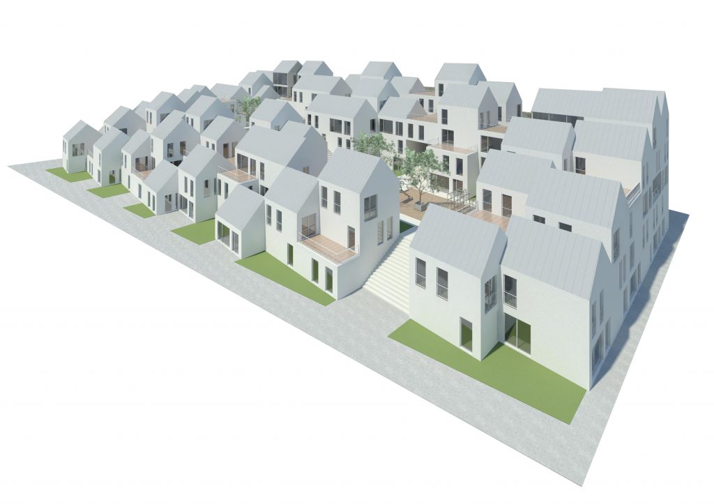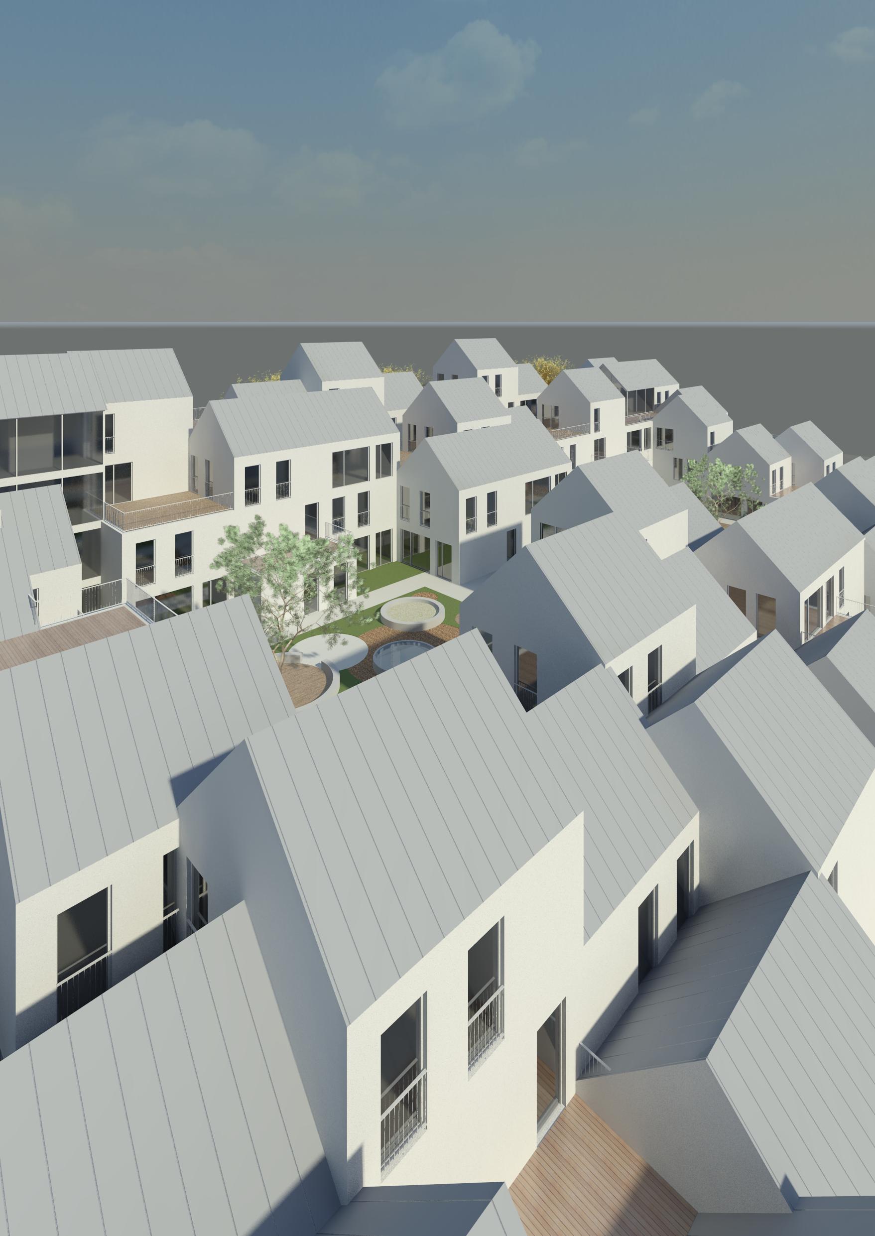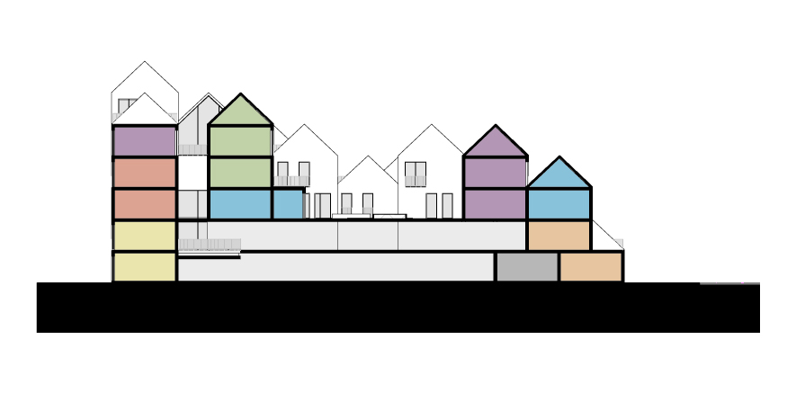 Het ontwerp is ontstaan door een grote hoeveelheid “huisjes” van 6×6 m te clusteren in een soort heuveldorp. De woningen bestaan uit 3 of 4 blokjes en zijn daarmee tussen de 95 en 125 m2 groot. In totaal bevat het bouwblok 50 woningen en is er ruimte voor zo’n 80 parkeerplaatsen.