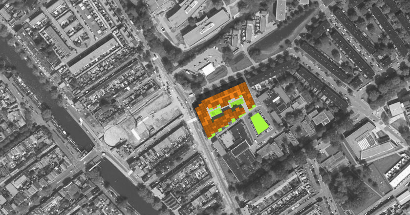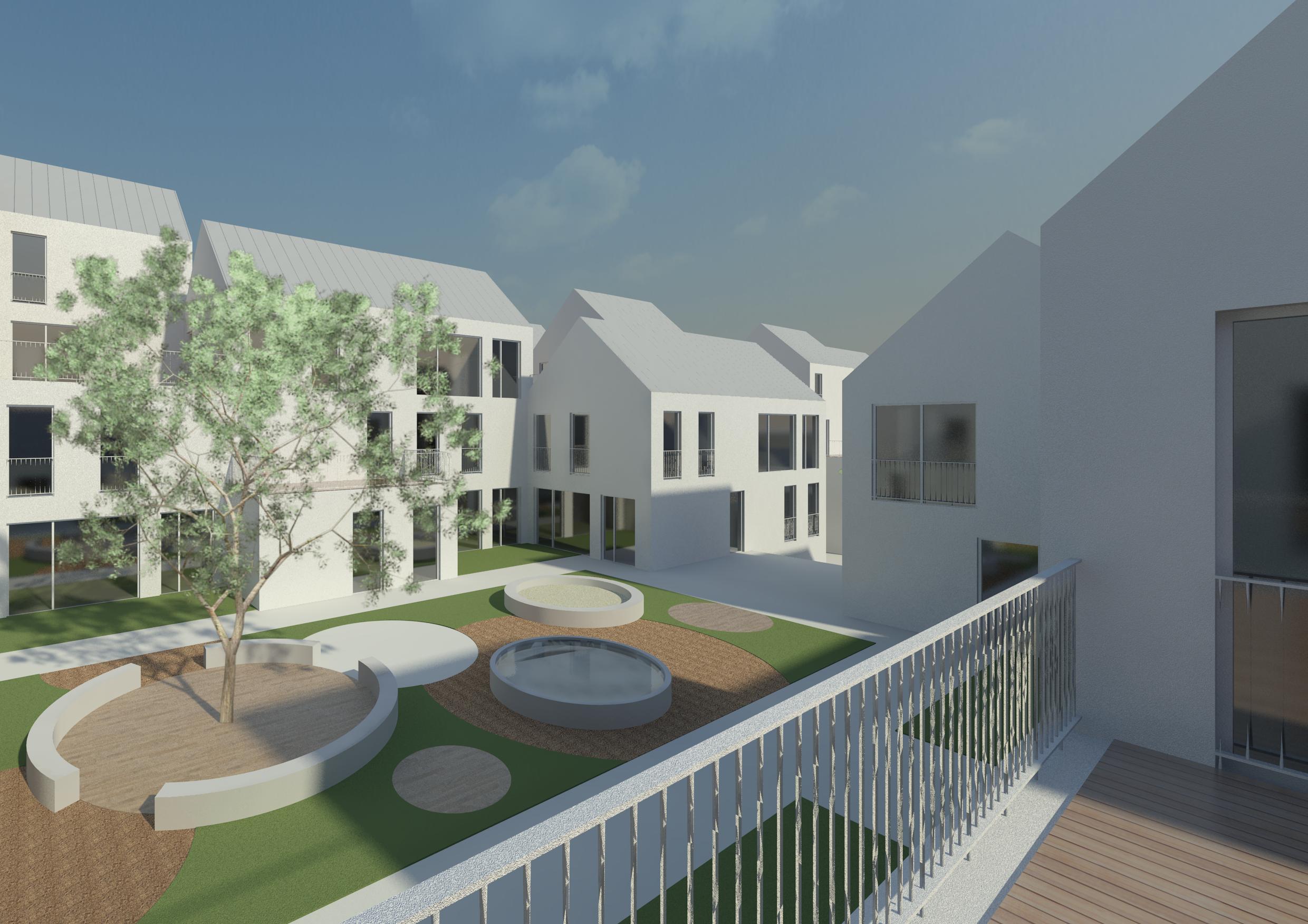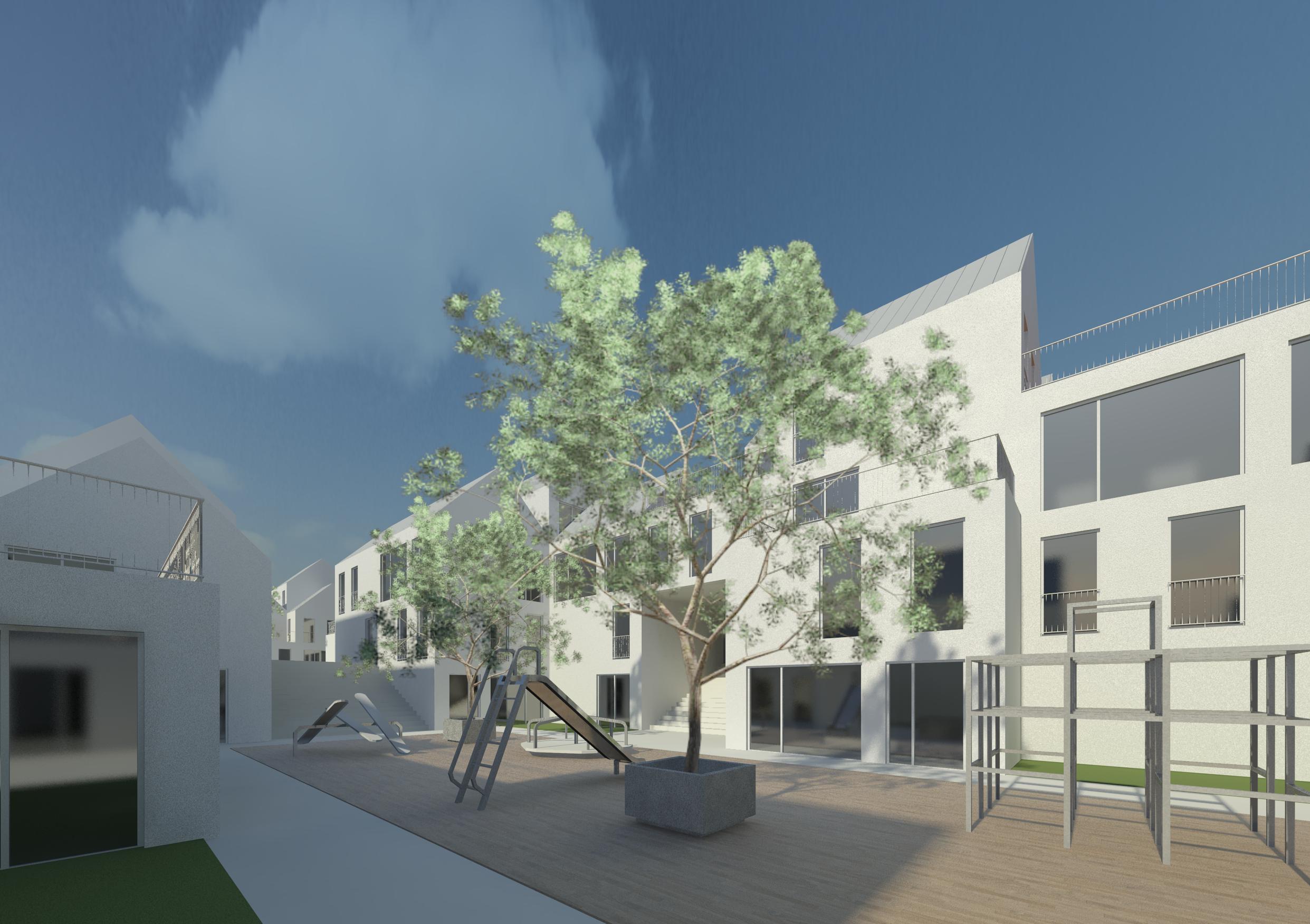 Het plan is een eigentijdse binnenstedelijke vertaling van de woonerfgedachte uit de jaren 70: In het hart van het bouwblok bevinden zich twee collectieve pleintjes.