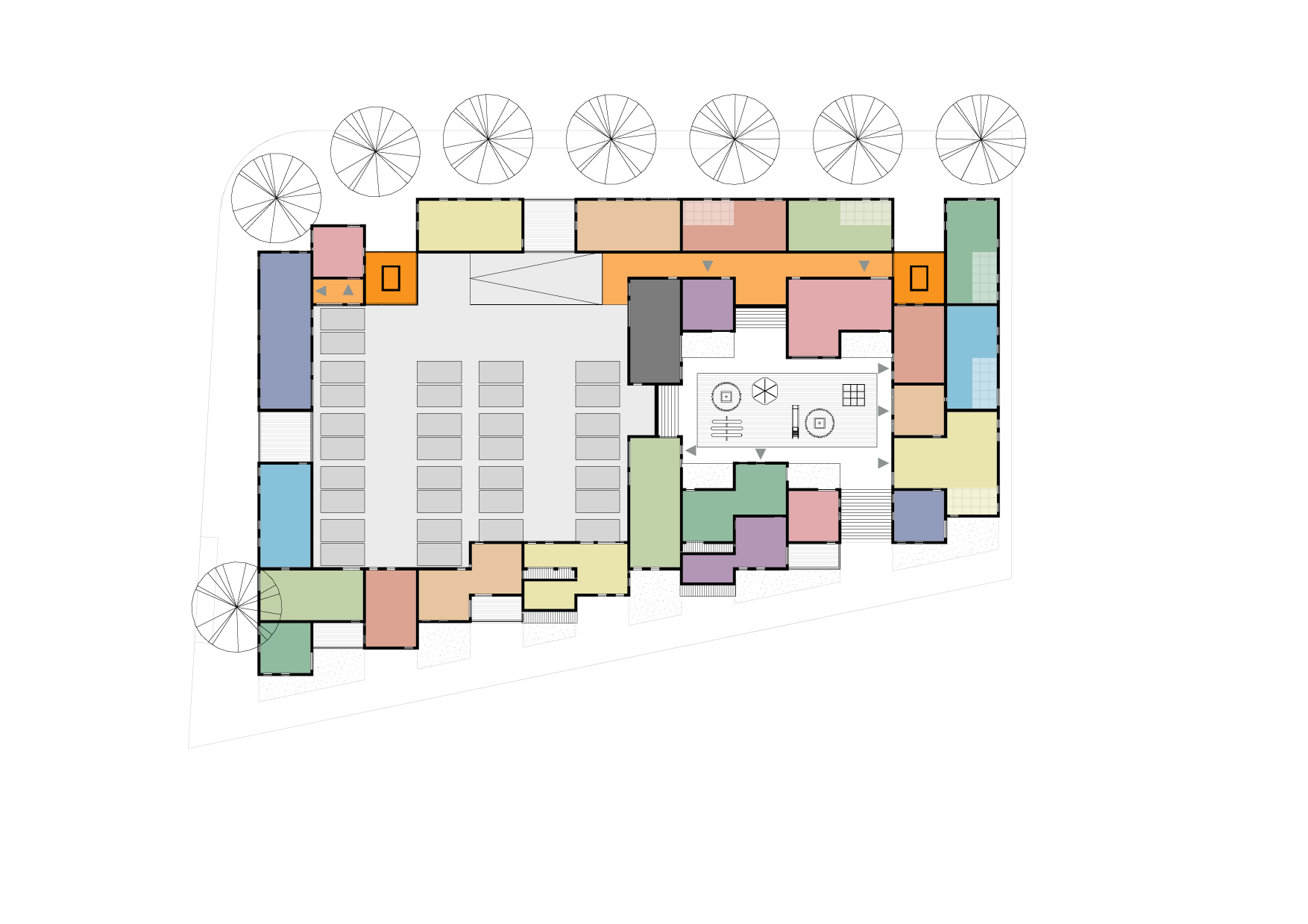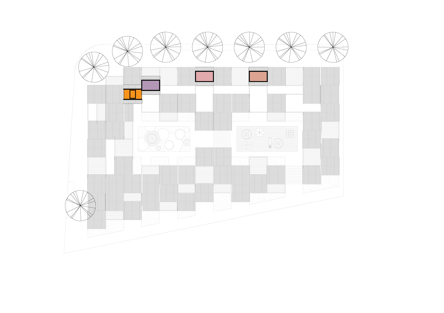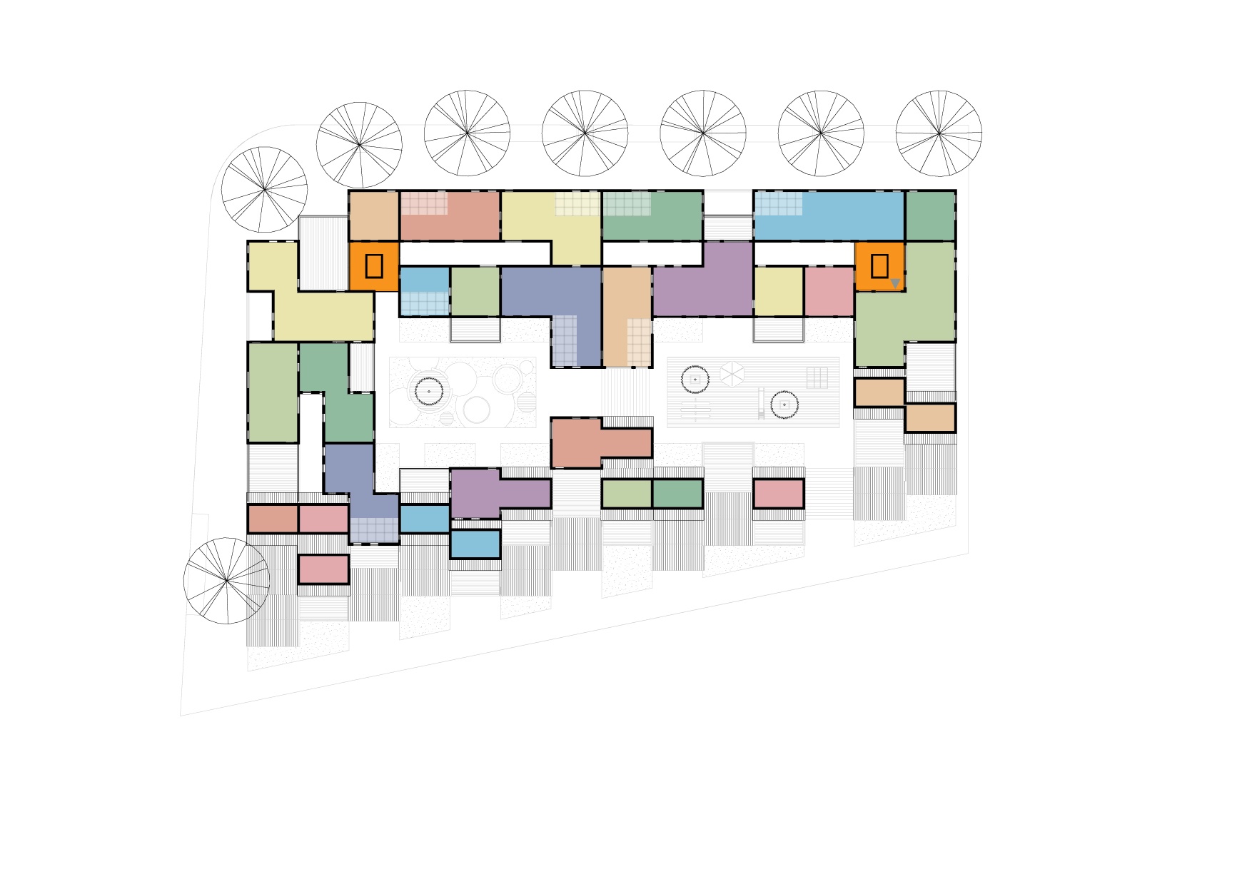 Het plan is een eigentijdse binnenstedelijke vertaling van de woonerfgedachte uit de jaren 70: In het hart van het bouwblok bevinden zich twee collectieve pleintjes.