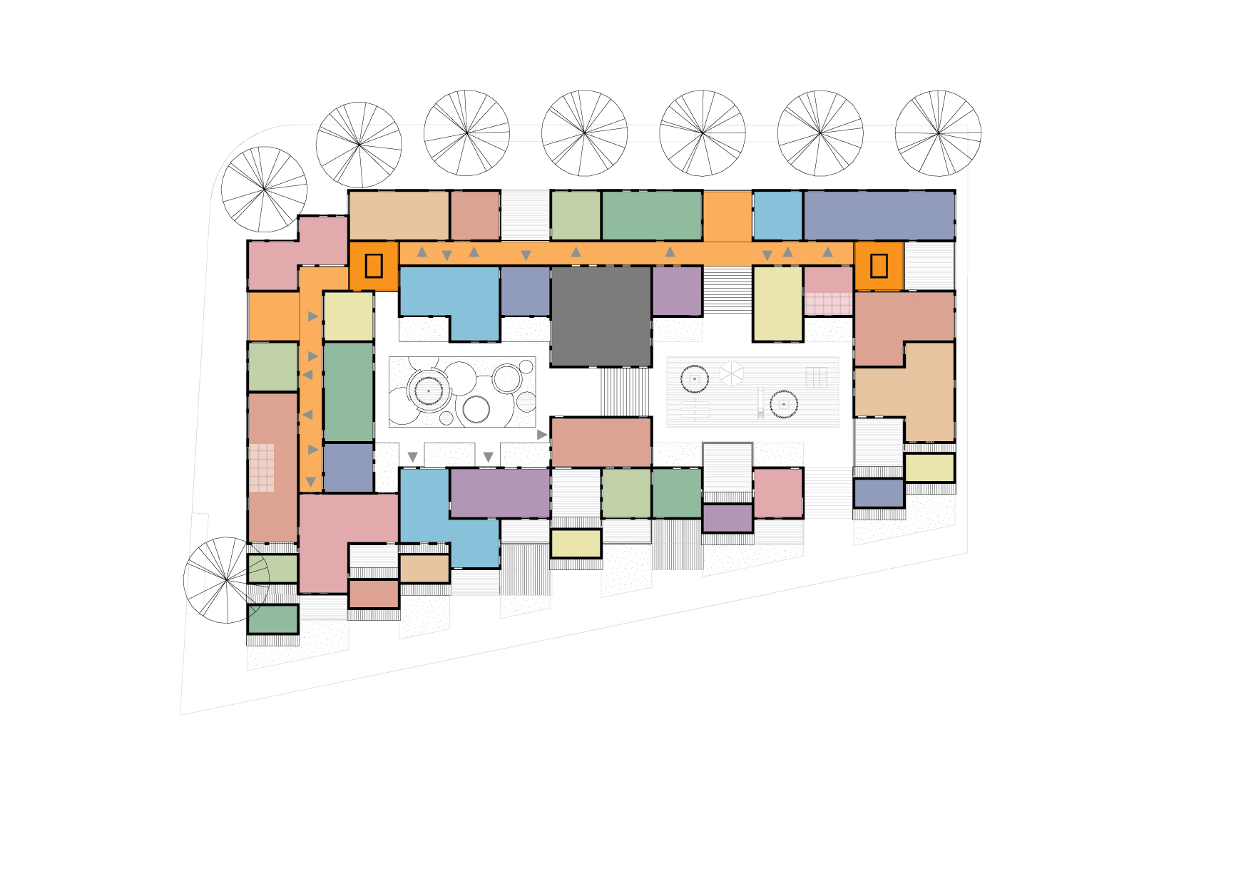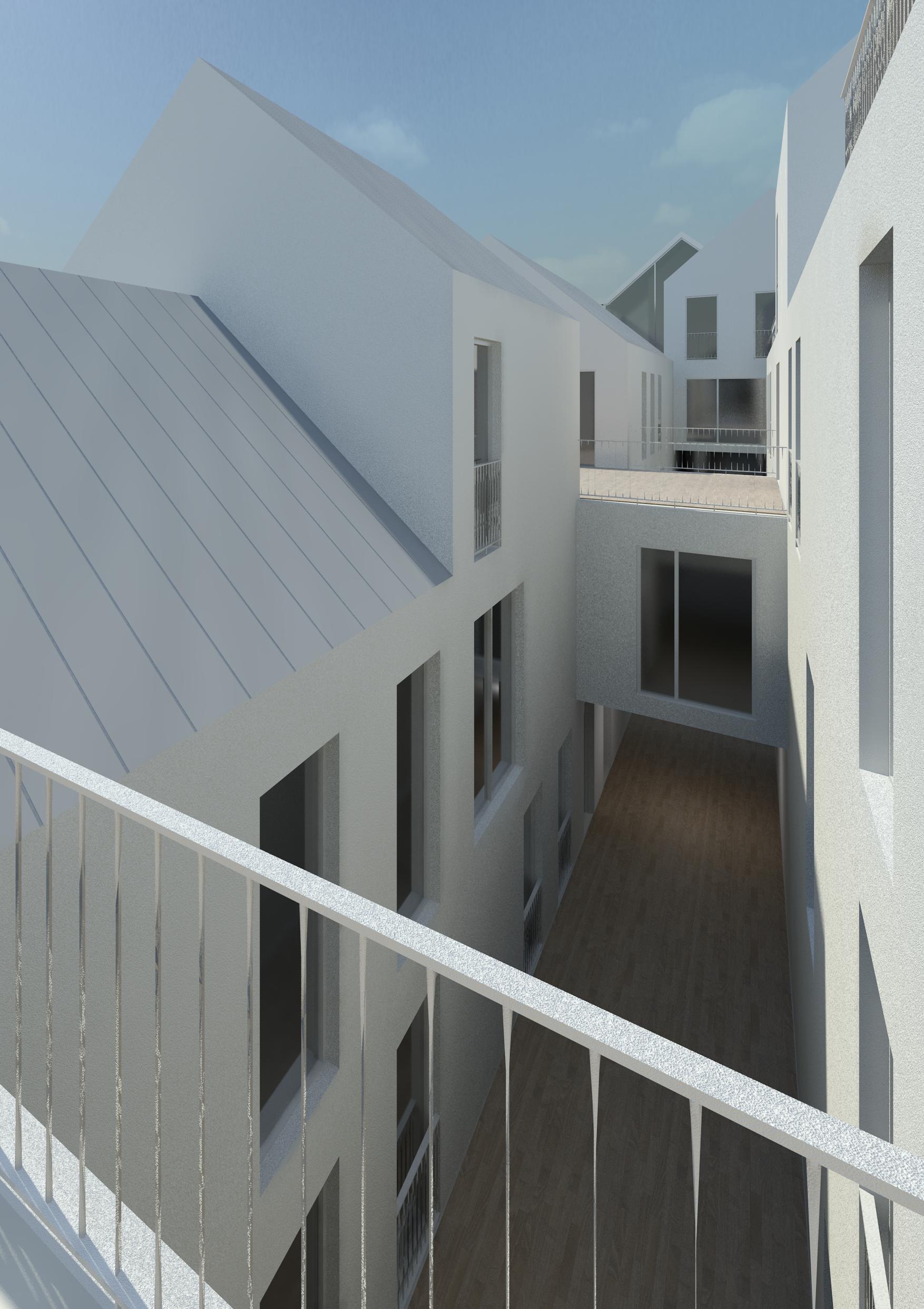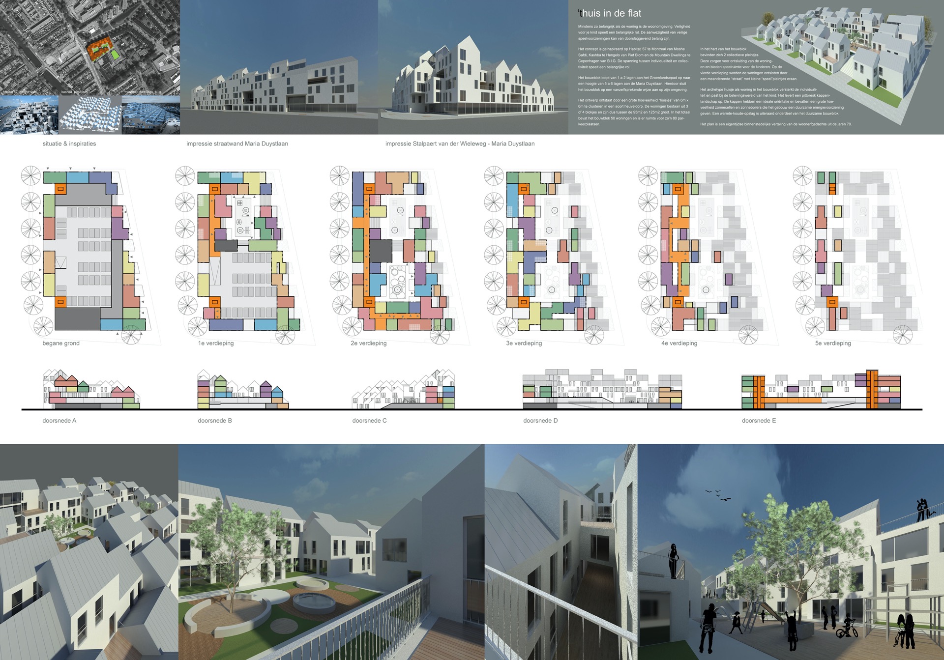 Deze zorgen voor ontsluiting van de woningen en bieden veilige speelruimte voor de kinderen. Op de vierde verdieping worden de woningen ontsloten door een meanderende “straat” met kleine “speel”pleintjes eraan.