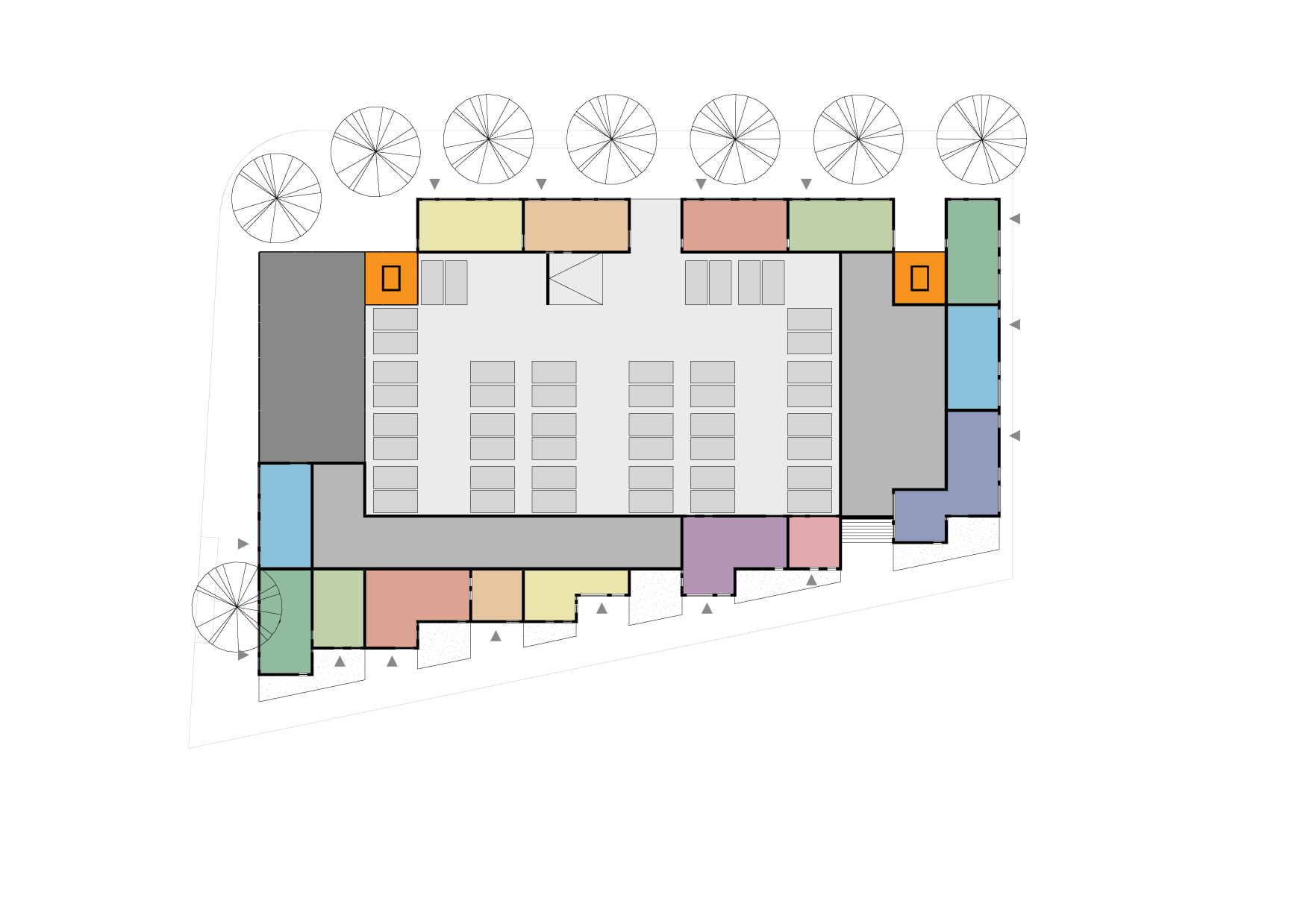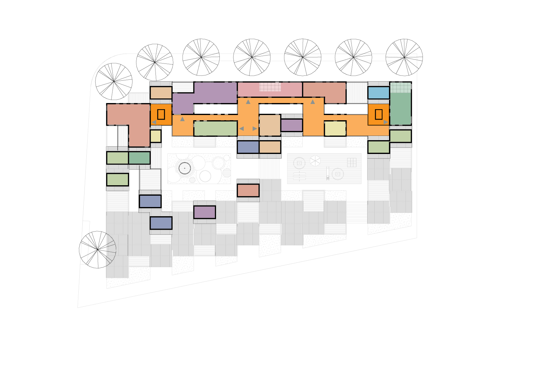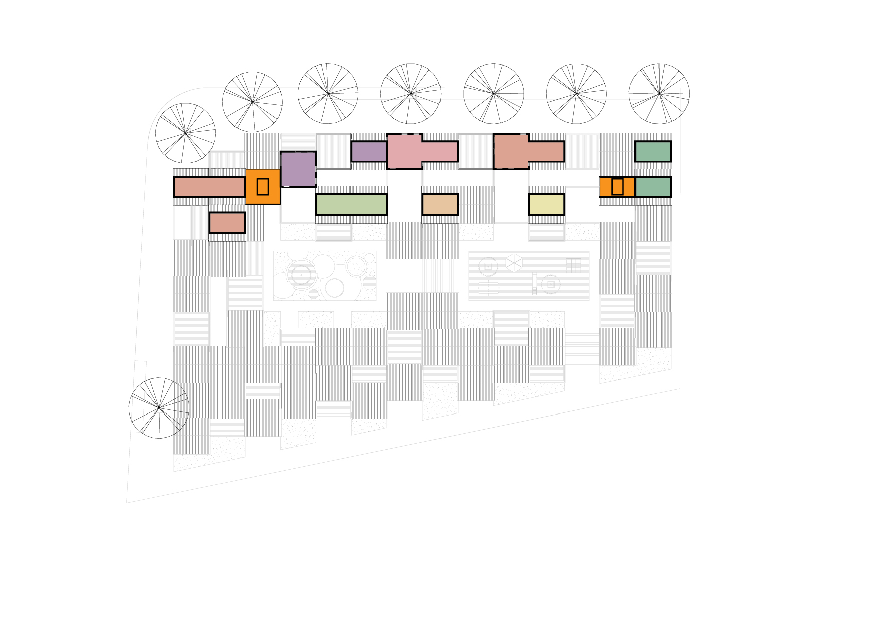 Deze zorgen voor ontsluiting van de woningen en bieden veilige speelruimte voor de kinderen. Op de vierde verdieping worden de woningen ontsloten door een meanderende “straat” met kleine “speel”pleintjes eraan.