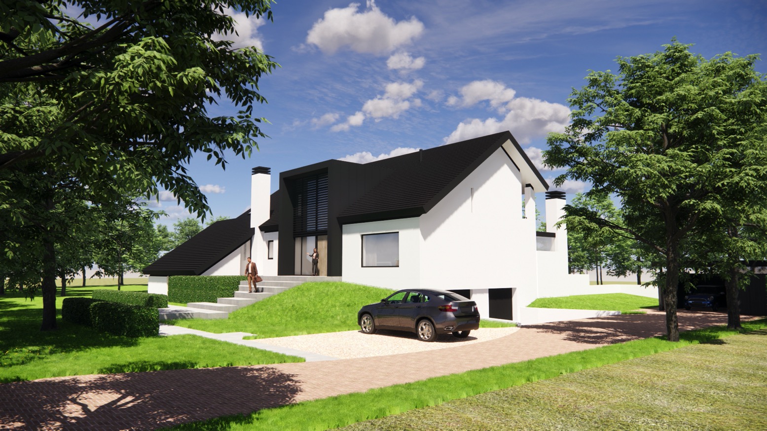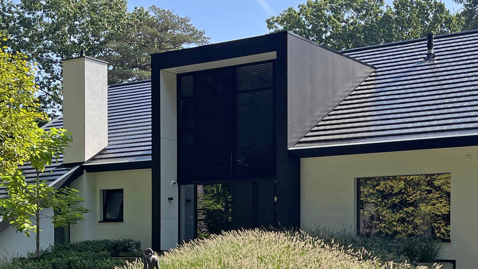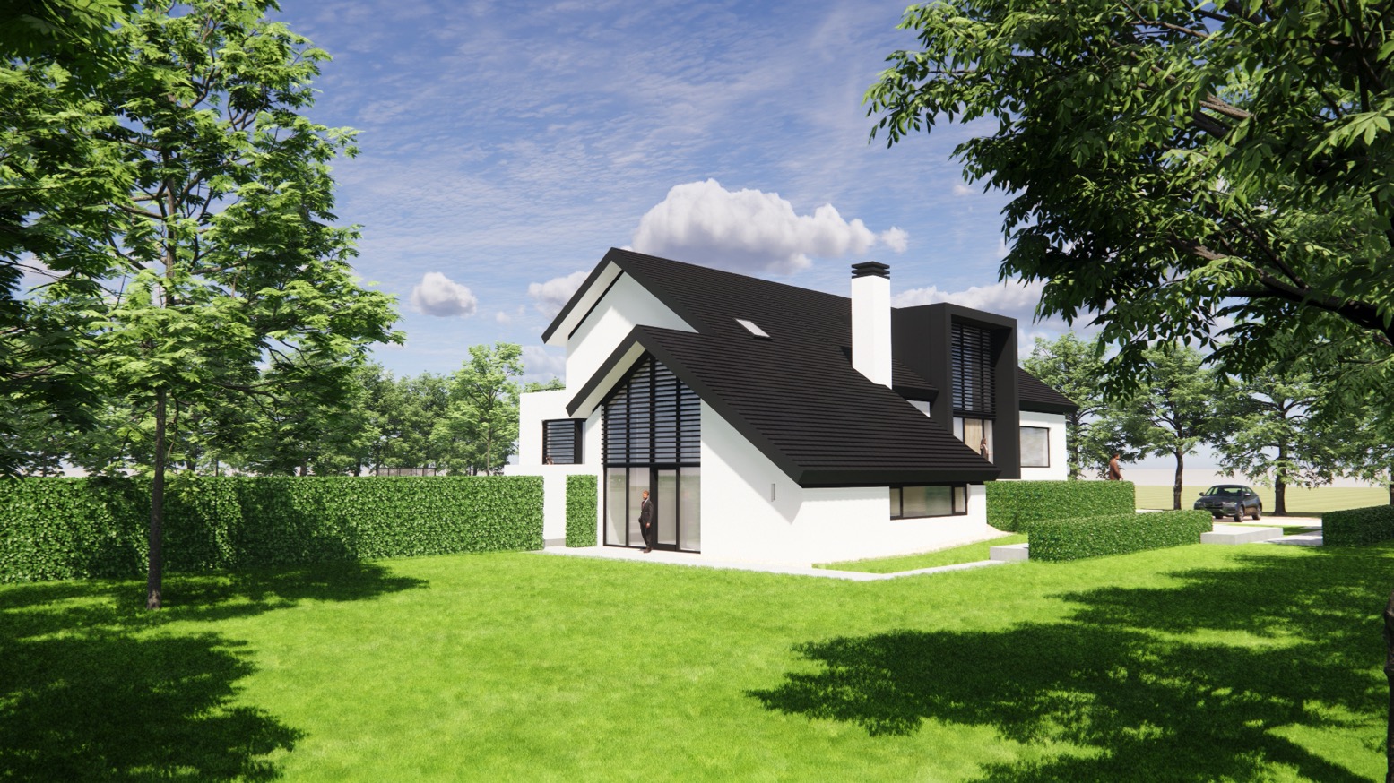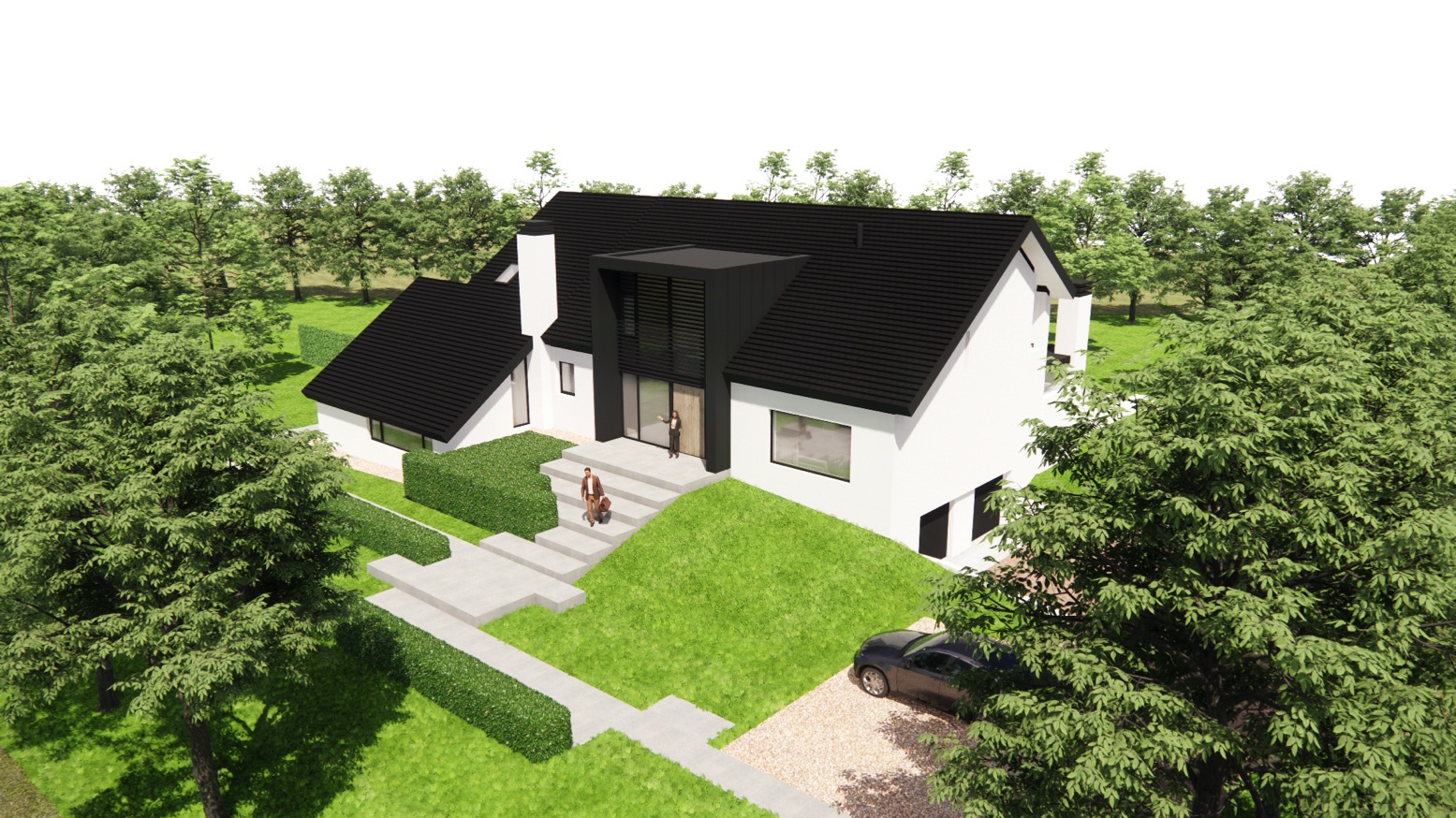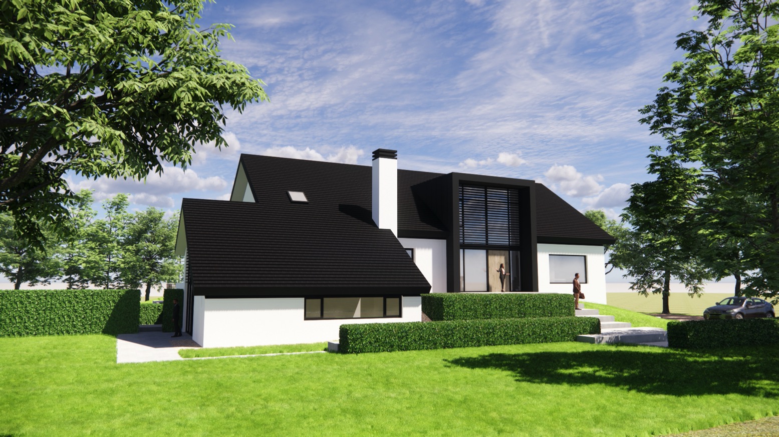Een ware metamorfose, waarbij het grote kader bij de entree gelijk in het oog springt. Gevelisolatie voorzien van witgeschilderd stucwerk en donkere leipannen op het dak geven de woning een strakke en moderne uitstraling.