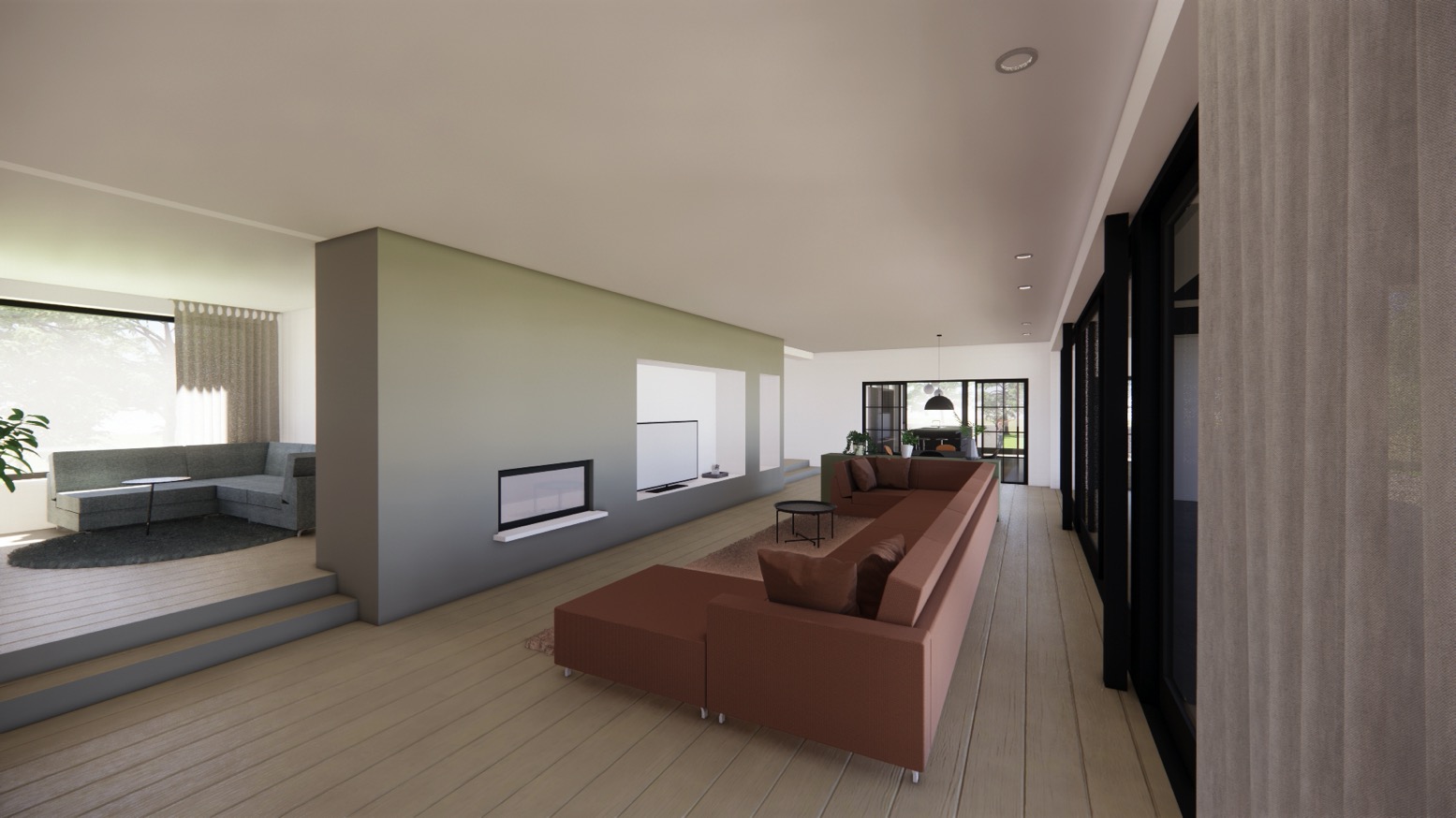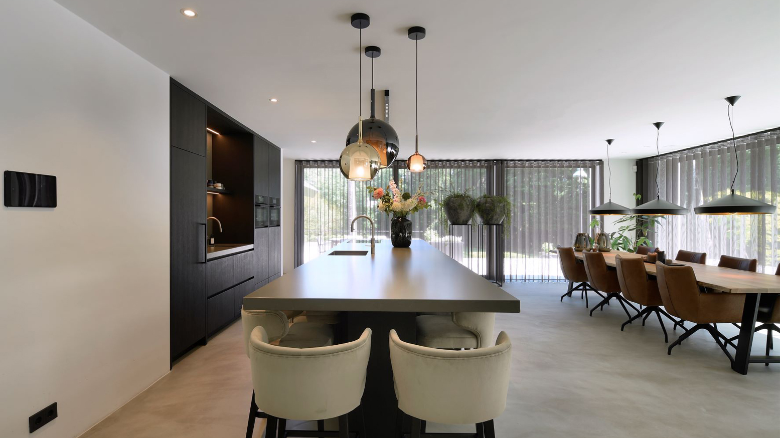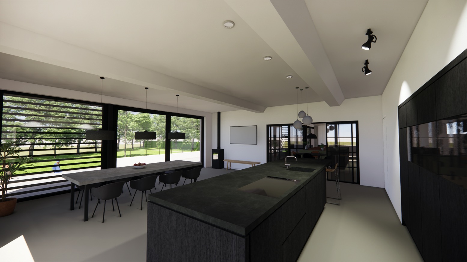 Het toch al niet geringe woonoppervlak is uitgebreid met een grote leefkeuken op de plek van het voormalige binnenbad. Grote puien zorgen voor veel licht en uitzicht op de tuin met zwembad en geven toegang tot een groot, deels overdekt terras.