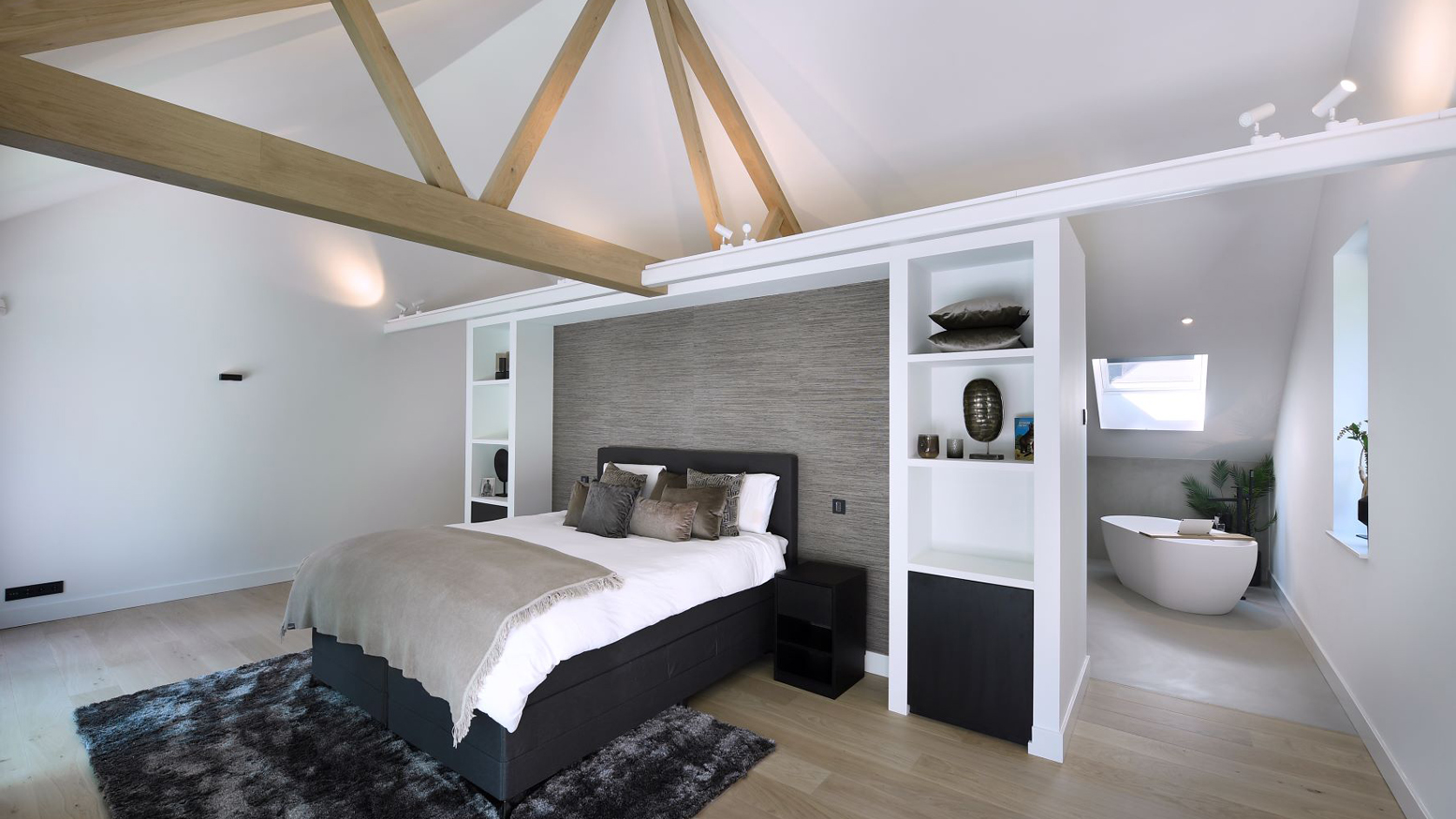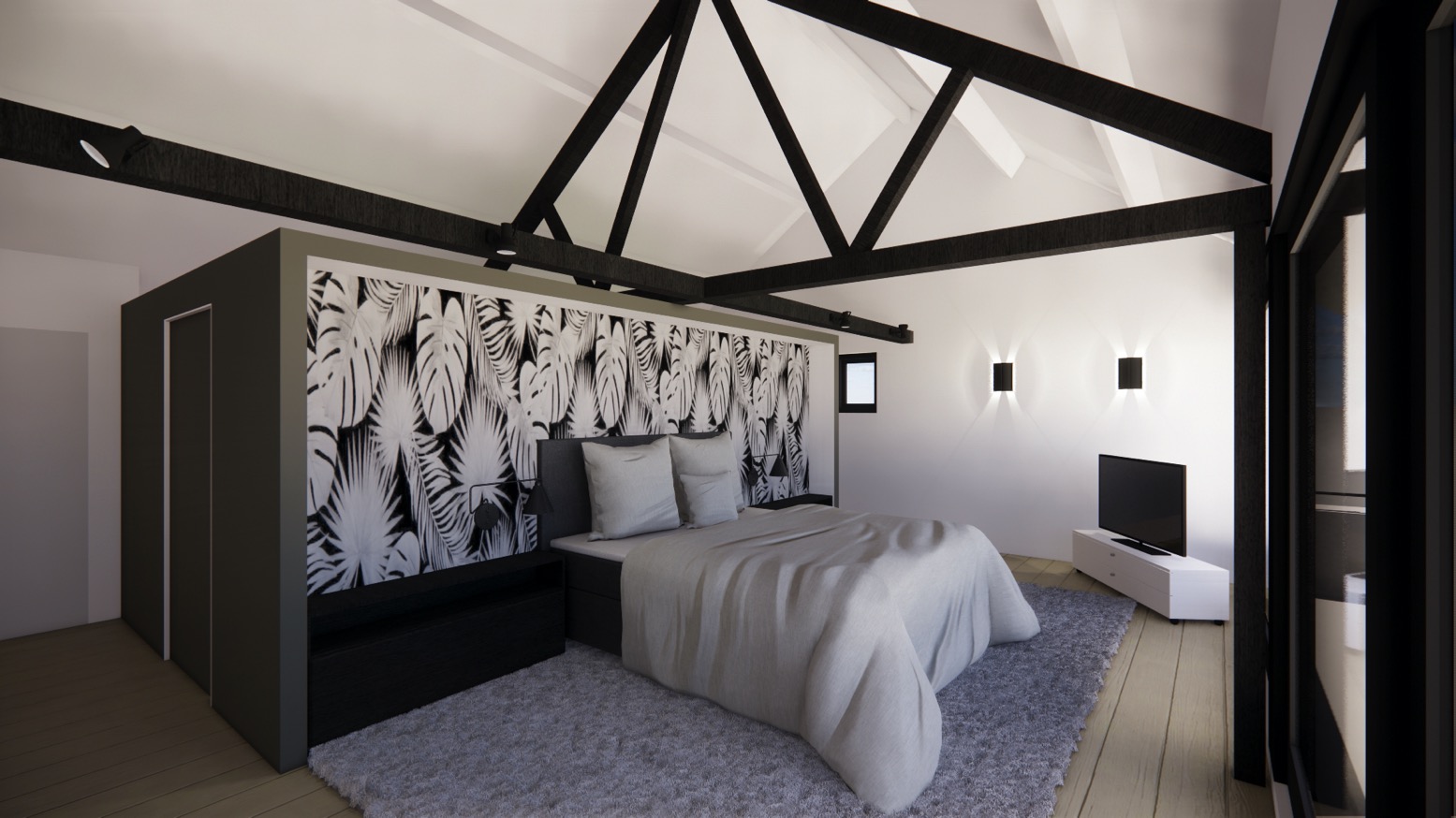De verdieping is opnieuw ingedeeld en op een aantal plaatsen is de zoldervloer weggehaald. Hierdoor zijn de slaapkamers opengewerkt tot in de kap, wat voor extra ruimtelijkheid en lichttoetreding zorgt.